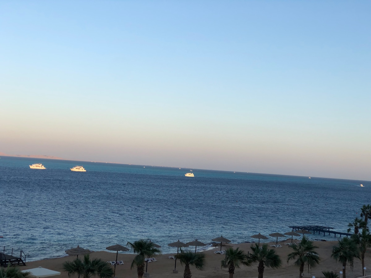 Détendez-vous dans notre confortable studio avec vue sur la mer dans le centre d'Hurghada, juste au bord de la mer Rouge. Parfait pour les couples, les voyageurs en solo ou les petites familles à la recherche de confort, d'emplacement idéal et d'ambiance de complexe hôtelier à proximité du centre-ville. Ce que vous aimerez : Accès gratuit à la plage privée et à la piscine Vue sur la mer Rouge et la piscine depuis votre balcon privé Emplacement privilégié sur Old Sheraton Street – à proximité des cafés, des magasins, de la vie nocturne et des supermarchés Wi-Fi gratuit, sécurité 24h/24 et stationnement sur place Navette gratuite dans la station