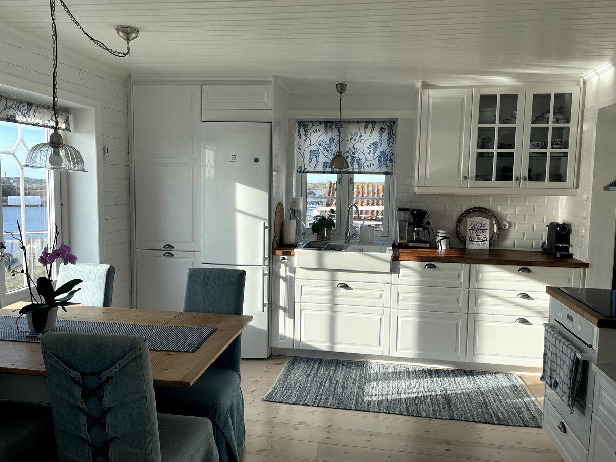 Cottage avec vue sur la mer dans un endroit isolé. Cuisine et salon ouvert, 2 chambres, 1 salle de bain, 1 toilette. La chambre 3 est située dans une maison d'hôtes séparée. Cuisine entièrement équipée avec lave-vaisselle, four à micro-ondes, cuisinière à induction et four. À 200 m de la mer avec des falaises et une plage de sable fin. Plusieurs patios meublés, pelouse et barbecue. À distance de marche de l'épicerie, de l'arrêt de bus et du ferry pour Åstol et Dyrön Tjörn offre tout, de la belle nature, de la natation, de la pêche, du paddle, de la randonnée à l'art et aux restaurants.