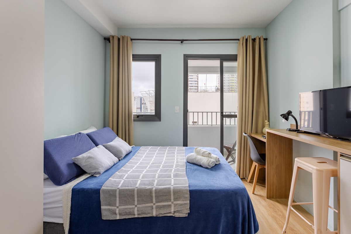 Cet élégant appartement de 50 m2 situé à Bela Vista, dispose d'un portier 24h/24. 2 chambres (seulement 1 avec climatisation et lit queen size, la seconde est assez petite et peut être utilisée comme bureau, équipé d'un canapé-lit double) et 1 salle de bain. Avec une vue imprenable depuis chaque fenêtre, c'est un endroit agréable pour travailler et se détendre. Le métro à jets privé sur le balcon est un endroit fantastique pour profiter de la vue sur la ville. Parking - télévision par câble/smart, réfrigérateur avec machine à glaçons, four, lave-linge et sèche-linge, plaque de cuisson, micro-ondes, lave-vaisselle et Internet ultra-rapide.