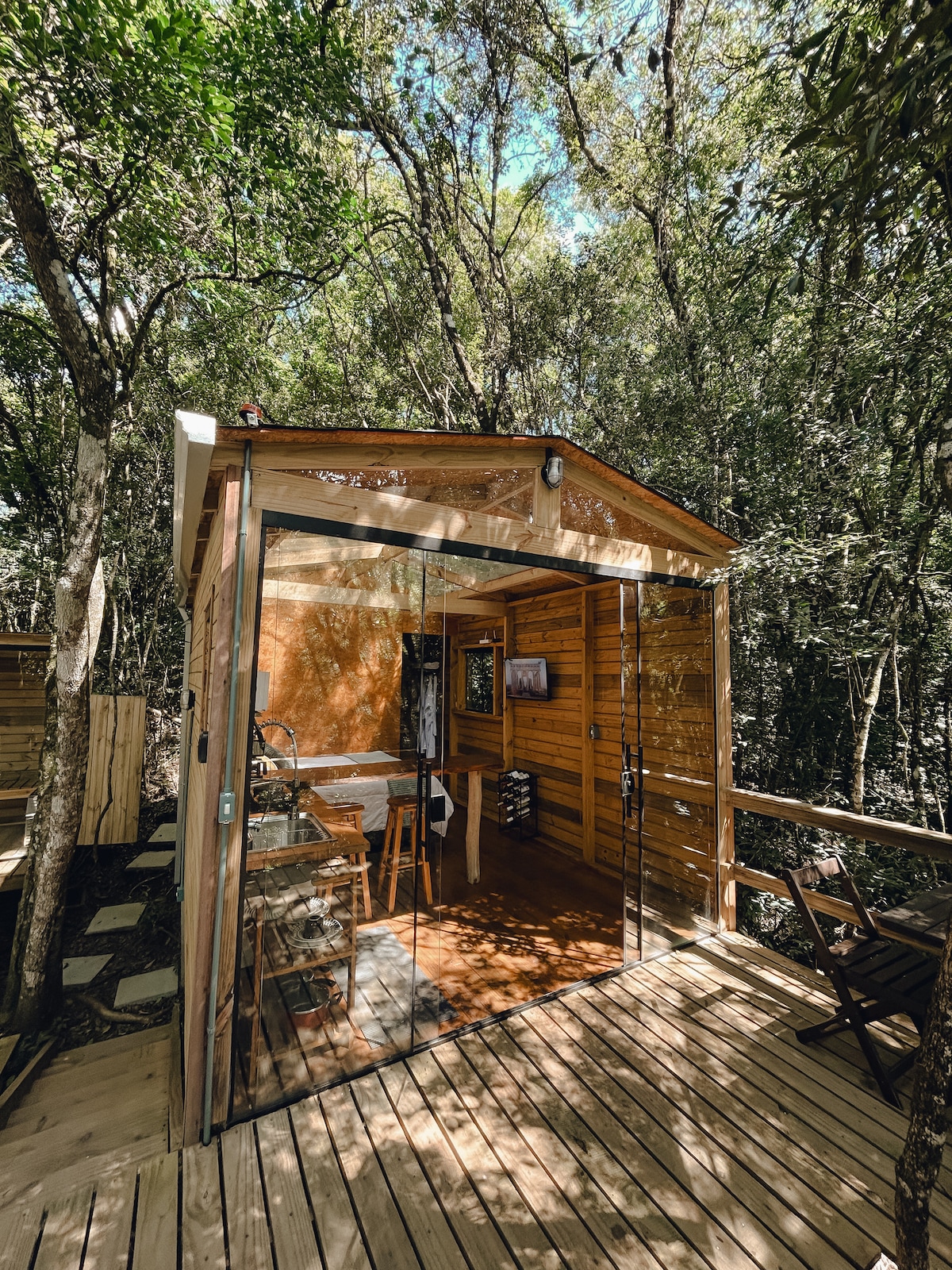 Uma hospedagem pensada e construída por mãos e corações. Amplas janelas de vidro proporcionam uma integração total com a natureza. Além de um bosque privativo com churrasqueira, redes, área de fogueira e um deck com banheira hidromassagem, a acomodação conta com sala, cozinha, banheiro com parede de vidro, cama de casal e espaço zen, TV Smart com Netflix e YouTube. Simplesmente perfeita! Mais que uma acomodação, ficar na Vibe é uma experiência difícil de explicar, mas muito fácil de sentir.