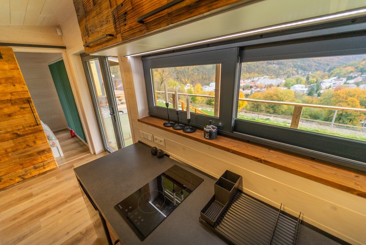 Construit de nos propres mains, des fondations jusqu'au mobilier intérieur fabriqué à la main. Les alentours de la maison ont été aménagés pour votre confort : terrasse avec chaises longues et baignoires pour se baigner en été, baignoire avec eau chaude pour les jours de printemps et d’automne, salon extérieur sur une terrasse partiellement couverte à côté d’un petit étang, espace pour faire des grillades. Et de la verdure plantée tout autour. Je voulais que les invités puissent apprécier la qualité et le confort à la fois visuellement et physiquement.