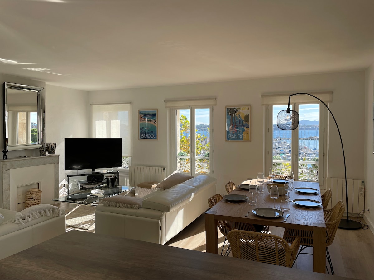 Logement unique situé dans le centre de Bandol face à l'ile de Bendor avec une vue à 180° degrés sur la Méditerranée. Le point de vue se mérite après la montée des marches vers l'appartement (impossible d'accès pour les personnes à mobilités réduites ou ayant du mal à marcher). La plage et le centre de thalasso " Ile Rousse/Thalazur" se trouvent à moins de 5 min à pieds. Un parking gratuit se trouve face au logement. La gare de Bandol est à 15 minutes de marche. Draps et serviettes fournis.