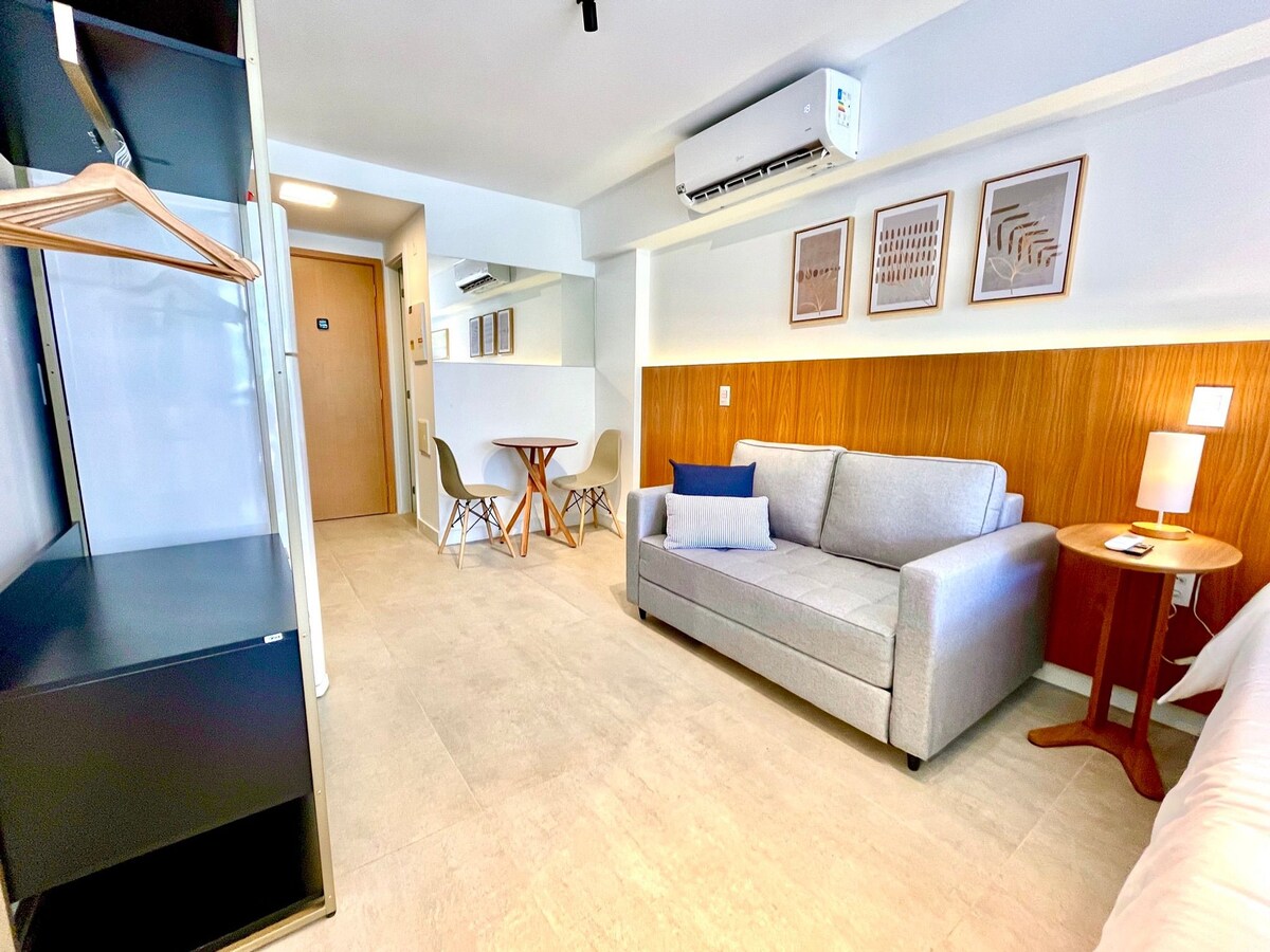 Lisez les 4 règles de la maison dans la section « Ce que vous devez savoir » et « Afficher plus ». Points forts: - Ménage quotidien de l'appartement inclus - Appartement récemment rénové, avec des meubles neufs - Infrastructure du bâtiment avec piscine, sauna, restaurant et salle de sport - Réception 24h/24 et 7j/7 - Serrure à mot de passe - Smartv de dernière génération dans le salon - Wifi haut débit - Peut accueillir jusqu'à 3 personnes, dont 1 sur le canapé (suggéré pour les enfants) - Cuisine complète - À côté des centres commerciaux Leblon et Rio Design - 5m à pied de la plage