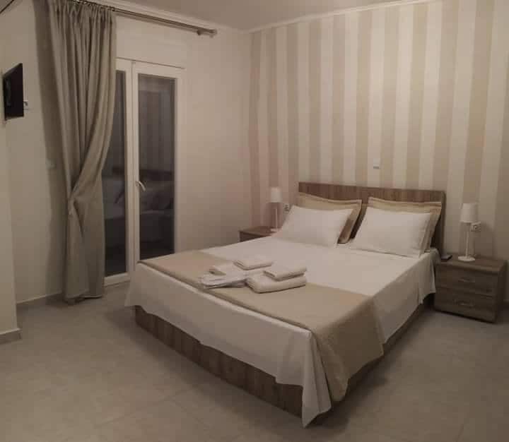 Bel appartement double avec vue sur la mer à Neos Marmaras de Chalkidiki. Situé à 50 mètres de la plage principale du village et à 50 mètres du centre du village à pied. L'appartement est au deuxième étage donc la vue depuis son propre balcon privé est magnifique. Elle dispose d'un lit double pour accueillir deux personnes et d'une cuisine privée que les gens peuvent utiliser pour leurs repas.