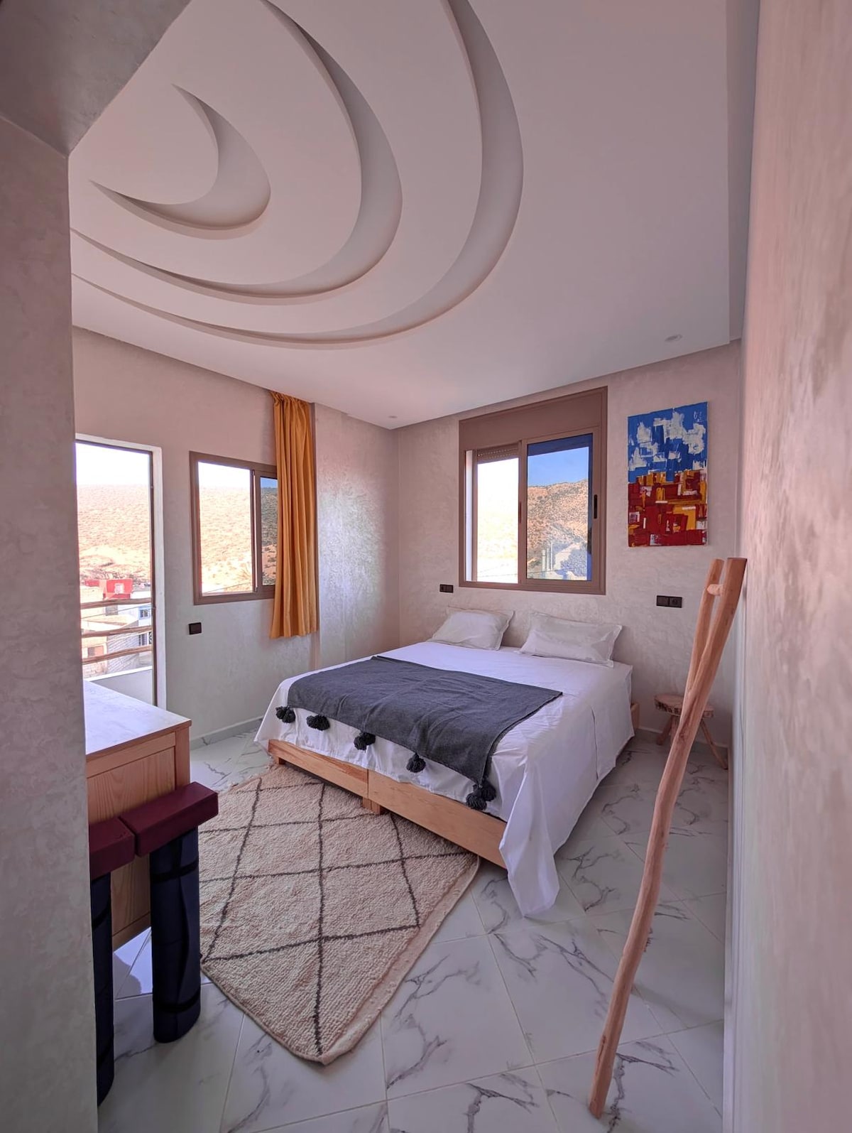 On a humble street perched atop the lovely surf town of Tamraght, you will find our house. Our rooms are light and breezy, with every detail handpicked, and lovingly put together. From our spacious rooftops, you have an expansive view of the sea, of the whole charming town, and the mountains. A full 360 panorama. Perfect for yoga, wave checks, and lounge. 5-10 min walk to shops, restos, and 15 min to the beach. We can cook up meals, and curate experiences. BREAKFAST (w/a view) INCLUDED.