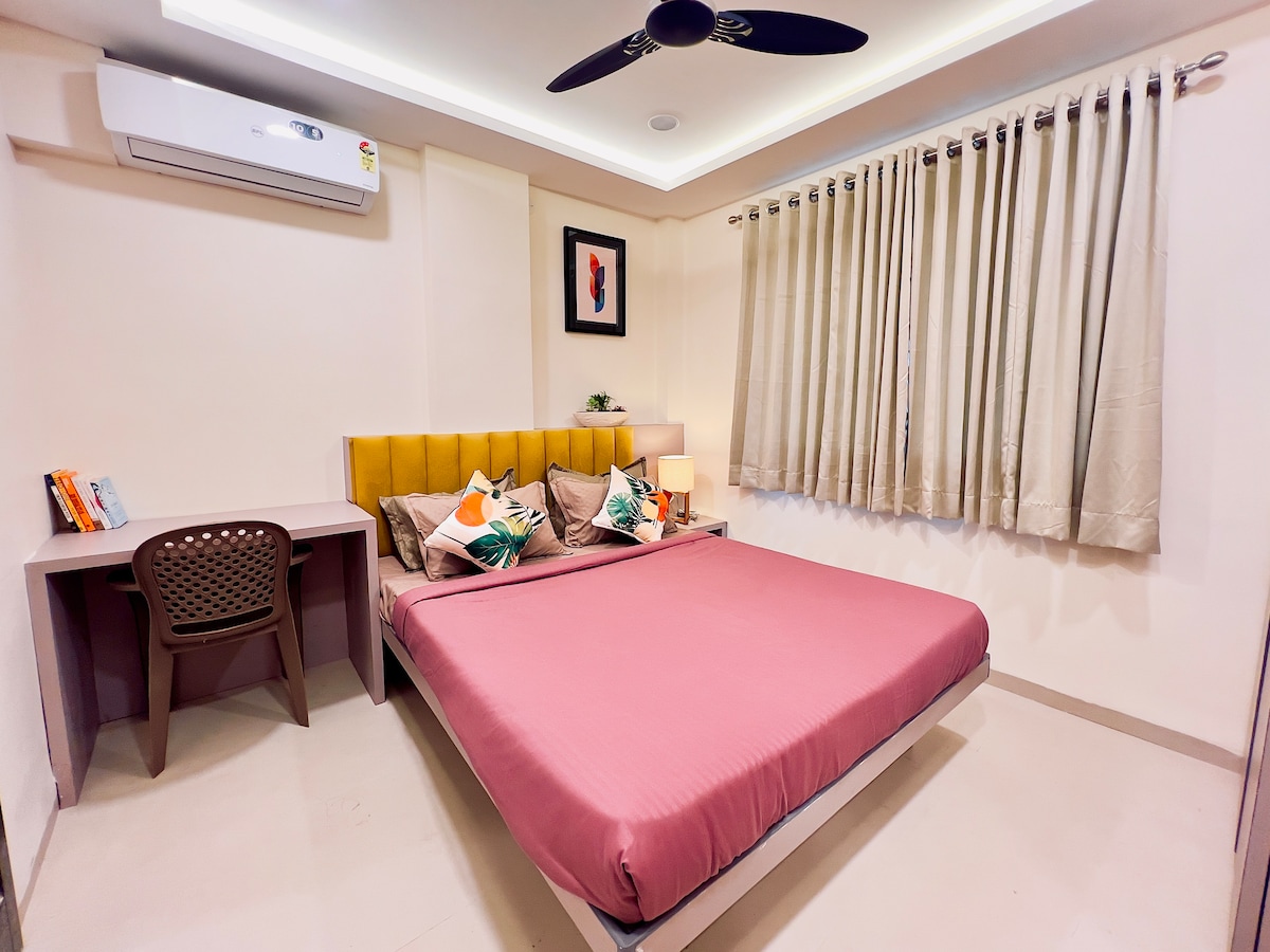 A self check-in, hotel-suite style studio in Vijay Nagar, Indore perfect for couples on a staycation, solo women travellers & working professionals. It has a queen bed, cozy lounge seating, TV, foldable work desk, Wi-Fi & a balcony. Thoughtfully designed interiors & a equipped kitchen, the space gives you the comfort of a hotel and the freedom of a home. 10 mins to Farzi Cafe & Piano Project 10 mins to C21 Mall 25 mins to Airport & Station Ideal for short/long & romantic stays in Indore.