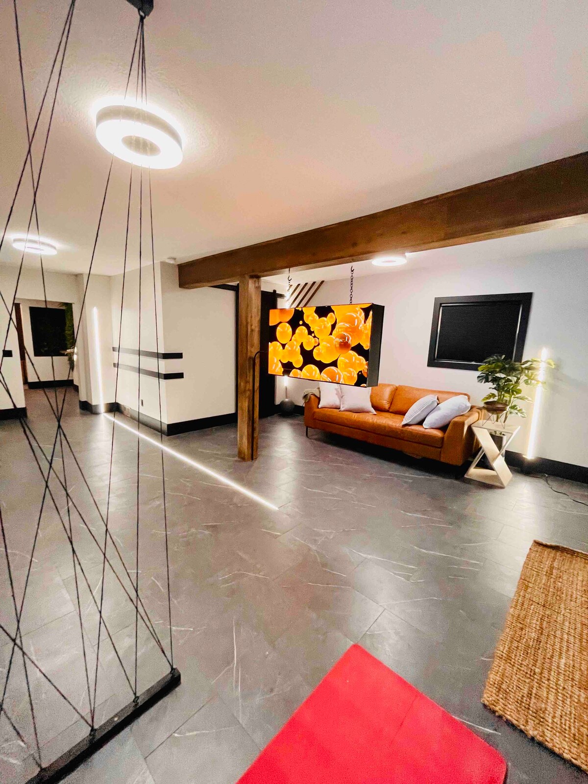 Pour notre troisième expérience, nous voulions vraiment créer une expérience de penthouse de charme dans une maison. Au lieu de dépenser 500 $ pour une chambre d'hôtel, nous voulions créer un espace unique pour moins cher. Reposez-vous ou prenez vie en vous relaxant dans la salle de bain de type spa équipée d'un sauna et d'une douche à effet pluie. Détendez-vous ou ressourcez-vous en réglant les lumières sur des auras illimitées en appuyant simplement sur un bouton. Méditez ou faites de l'exercice devant des vidéos de nature en 4K sur un téléviseur vertical de 85 pouces. Profitez d'un feu de joie. Bienvenue à LNSNG LXRY III