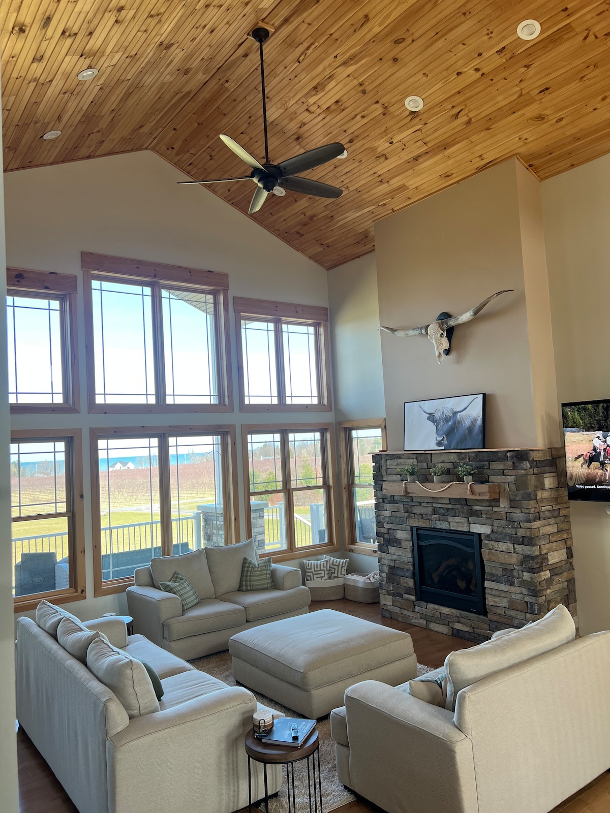 75’ Lakefront | 6 Outdoor Zones | Wellness Nook Relax at True North, a 2,500 sq ft sanctuary with 6 outdoor living spaces (4 patios/2 decks). ✔ Host: Custom beverage bar with 50lb ice maker & wine fridge (BYOB). Enjoy the granite kitchen & wood-fired pizza oven. ✔ Wellness: CLIMBR gym with lake views, canoe/life vests, & sandy beach access (0.1 mi). ✔ Retreat: Dual Master Suites with private balconies. Spot Bald Eagles & swans from the fire pit. High-end comfort for 8!