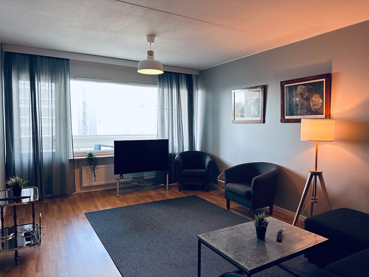 Appartement spacieux et rénové de 2 pièces bien équipé de 56 m2 avec un balcon dans un quartier calme d'Espoo. Il peut confortablement accueillir 4 personnes ou une famille. À environ 10 min à pied de la plage et de la mer voisines, le grand centre commercial Iso Omena avec de nombreux bons restaurants abordables et la station de métro Matinkylä est à 12 min à pied. Le centre-ville d'Helsinki est à 20 min en métro. L'aéroport est à 1h en transports publics ou à 30 min en taxi.