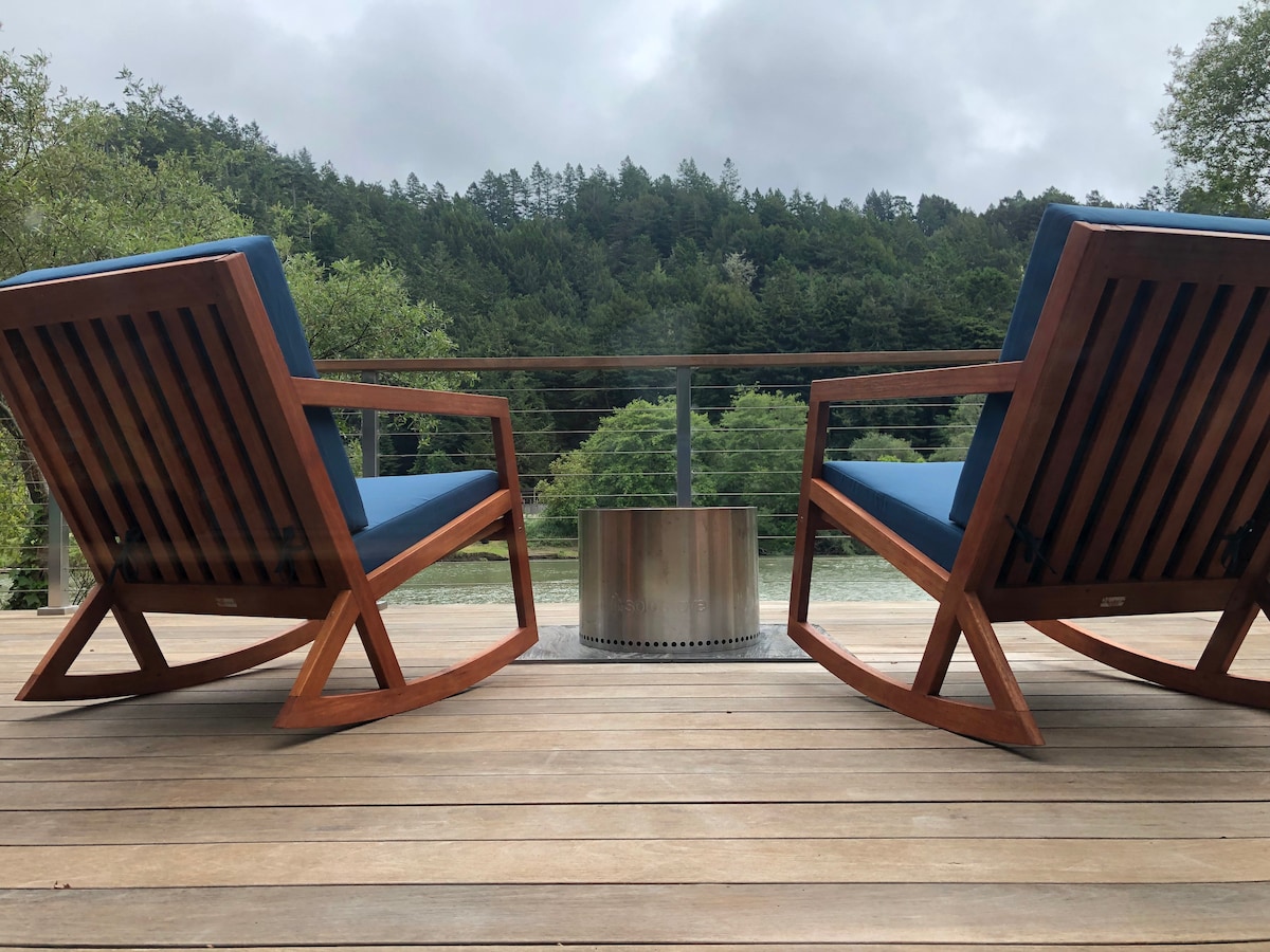 Bienvenue dans notre charmant chalet, une retraite récemment rénovée et magnifiquement conçue nichée au milieu des arbres à Duncans Mills, offrant une vue imprenable sur la rivière. Profitez de la tranquillité tout en sirotant votre café du matin ou en vous détendant avec un verre de vin sur la terrasse privée. Pour les amateurs de plein air, des kilomètres de sentiers de randonnée sont à quelques pas, vous permettant d'explorer la beauté naturelle de la région. Promenez-vous jusqu'à la boulangerie locale voisine ou faites un court trajet jusqu'à la côte.
