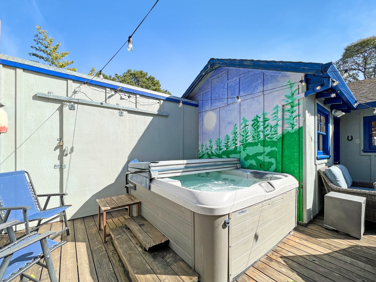 La cabane principale peut accueillir 4 personnes (ajoutez le nid de Quail pour 6 couchages). Les animaux sont acceptés, des frais s'appliquent. Emplacement ! Cette cabane est une combinaison rare d'une retraite tranquille avec une commodité inégalée, située à Jenner. À l'extérieur de la cour se trouve une boutique de café et de vin, souvent avec de la musique live, ainsi qu'un magasin C pour tout ce que vous avez oublié. Accès facile à la rivière/rampe de mise à l'eau. Tournez l'autre direction depuis la cour et trouvez les Jenner Headlands pour une randonnée pittoresque. Le jacuzzi sous les étoiles complète la journée !