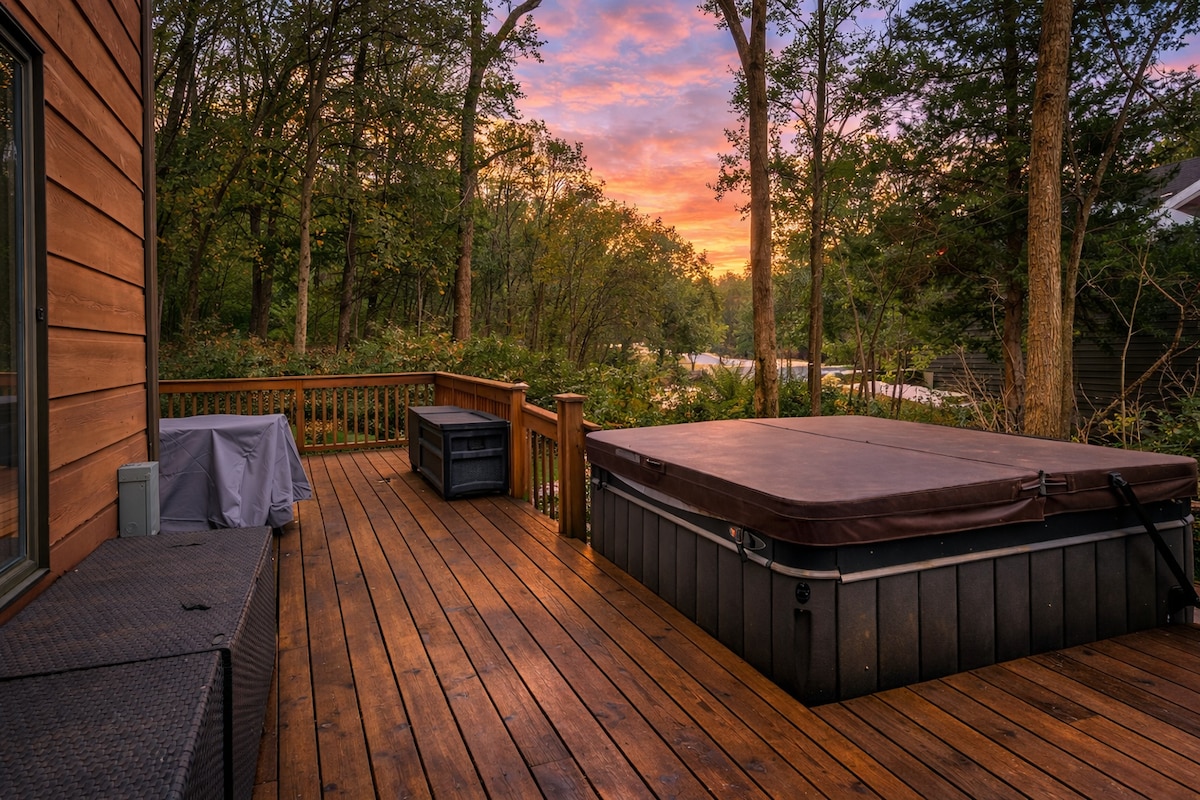 Évadez-vous dans votre propre retraite de montagne spacieuse à seulement 8 miles du centre-ville historique de Galena ! 2 min de Chestnut Mountain. Profitez d'un tout nouveau jacuzzi, d'un foyer avec du bois gratuit, d'un barbecue au gaz et d'un patio parfait pour les nuits d'été ou les journées d'automne fraîches. Passez vos journées à faire de la randonnée, du golf, du shopping ou faire des visites de vignobles pittoresques. À l'automne, explorez le feuillage animé, les festivals et le charme local. Après vos aventures, détendez-vous dans le confort et le style avec beaucoup d'espace pour toute la famille.