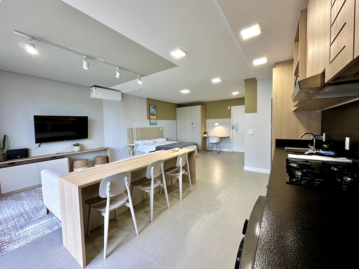 Loft moderno e cheio de charme, a poucos passos da praia. Arquitetura com alma modernista, muita luz natural, varanda com jardim privativo e obras de arte originais. O clima é leve, inspirador — ideal para relaxar ou trabalhar em home office. Em uma rua tranquila com acesso direto à praia, no Rio Tavares — bairro jovem, vibrante e conectado, perto de cafés, mercados e ótimos lugares para comer e curtir.