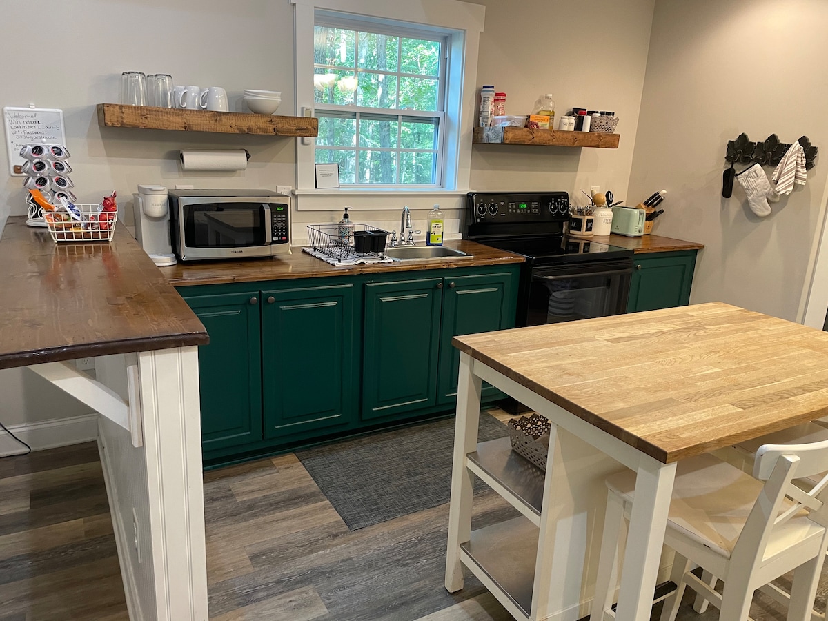 Cozy guest cottage backed by woods! 550 sq ft private house with loft bedroom, kitchen and bath (PLEASE NOTE NO FREEZER -only fridge) 30 min from Raleigh, Cary, Apex, and 10 min to Fuquay-Varina with 10 minute access to the 40. High speed wi-fi, smart tv, and complimentary coffee.Street parking-May not be a good fit for people with mobility issues. The front door is 110 steps from the street including a stone pathway down the lawn. Very dark at night-use phone light on path.