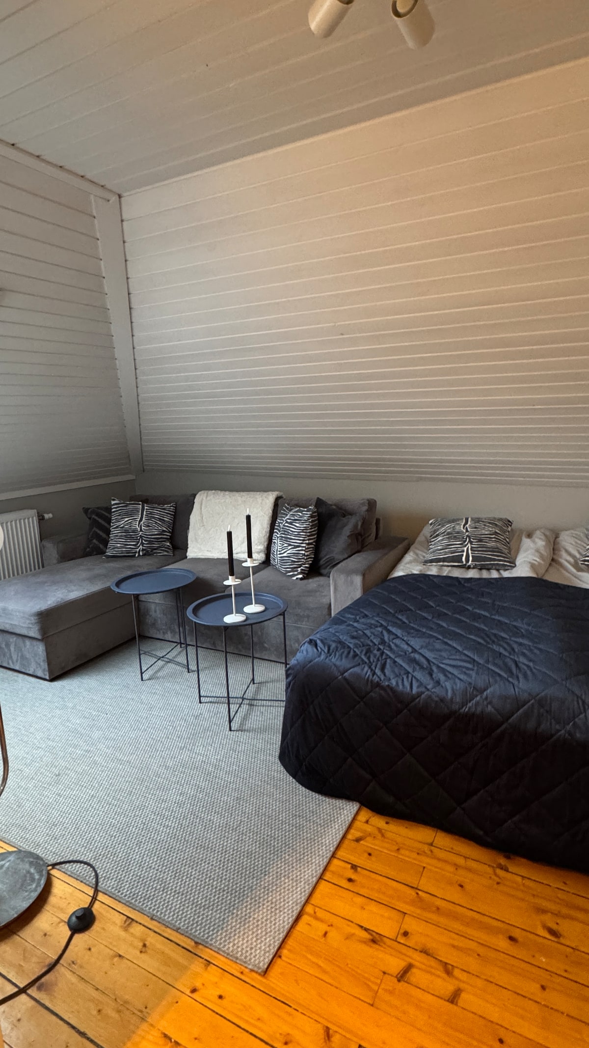 Appartement unique et de charme avec 2 pièces et cuisine d'environ 60 m². Entièrement rénové avec une touche moderne. Cuisine spacieuse pour cuisiner et se retrouver. Chambre avec un lit double confortable et un canapé-lit queen size. Emplacement idéal - central avec d'excellentes communications. À seulement 10 minutes en bus ! Serrure à code numérique pour un enregistrement et un départ faciles. Bonne connexion Wi-Fi et parking gratuit dans la zone. L'appartement est de haut standing et situé dans notre sous-sol et dispose d'une fenêtre givrée. L'appartement dispose d'une entrée séparée de la maison.