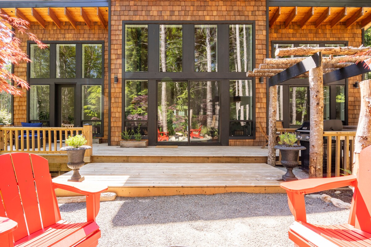Tout le confort d'une cabane moderne dans notre « Jordan River Cabin » nouvellement construite nichée au milieu de 3 acres de grands conifères avec des vues de fenêtre du sol au plafond. Allumez le barbecue sur la terrasse enveloppante. Le poêle à bois est fourni avec du petit bois et du bois de chauffage. Concept ouvert, cuisine entièrement approvisionnée avec tout ce dont vous avez besoin. Linge de maison pour 2 chambres king size et 2 salles de bain avec douche à effet pluie, une immense baignoire à remous à l'étage, une douche à effet pluie extérieure chaude + un bain à remous en bois de cèdre chauffé au bois et une terrasse de méditation nouvellement ajoutée !