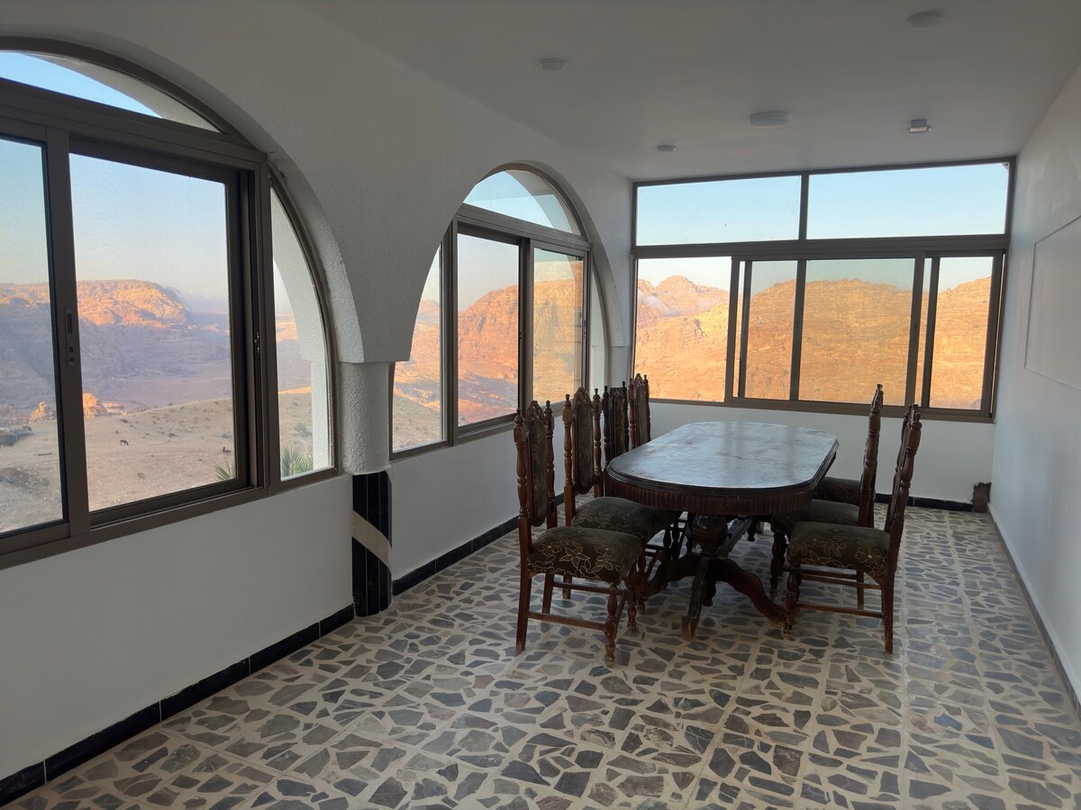 Ma maison privée de 3 étages dispose de 6 chambres pour les voyageurs : 1 au rez-de-chaussée et 5 au 2e étage, en bas, vous trouverez une grande cuisine en céramique et une salle à manger pour tous les gourmands. Les autres espaces publics sont mon salon, le salon, le jardin et les balcons. La maison surplombe Petra depuis le village bédouin d'Umm Sayhoun. Lever et coucher du soleil ! En tant que local, je suis heureux de vous aider à vivre une excellente expérience.