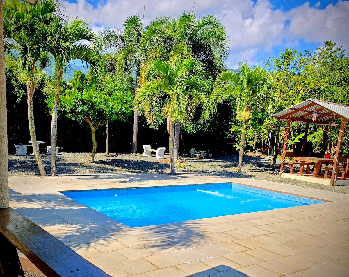 Propriété à 1 heure de la ville, dans le village de Piedra Blanca, 15 minutes avant Bonao, horaires d'arrivée et de départ flexibles (à consulter), en entrant par un chemin de campagne (non goudronné). 2 chambres spacieuses, l'une avec climatisation, 2 lits queen et sa salle de bain et l'autre avec ventilateurs, 2 lits jumeaux et un lit king et sa salle de bain, canapé-lit. Gazebo, espace barbecue, cuisine au feu de bois, piscine, traversée de 2 ruisseaux, wi-fi et télévision. Idéal pour la famille et les amis.
