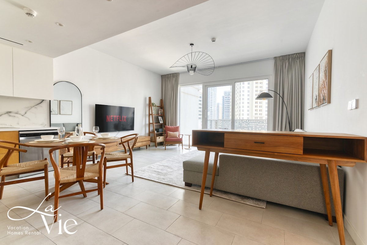 Luxe expérimenté dans notre appartement 1BR entièrement équipé à La Vie, JBR. Profitez d'une piscine privée avec vue imprenable sur la mer et l'Ain Dubaï, ainsi que d'un accès exclusif à la plage. Idéalement situé pour accéder aux attractions touristiques, l'espace dispose d'un salon accueillant avec une télévision de 65 pouces, d'un canapé en forme de L et d'un balcon pour une brise rafraîchissante et une vue captivante sur Dubaï. La chambre dispose d'un lit king size, d'un accès facile à la salle de bain et d'une cuisine entièrement équipée avec un lave-vaisselle pour plus de commodité.