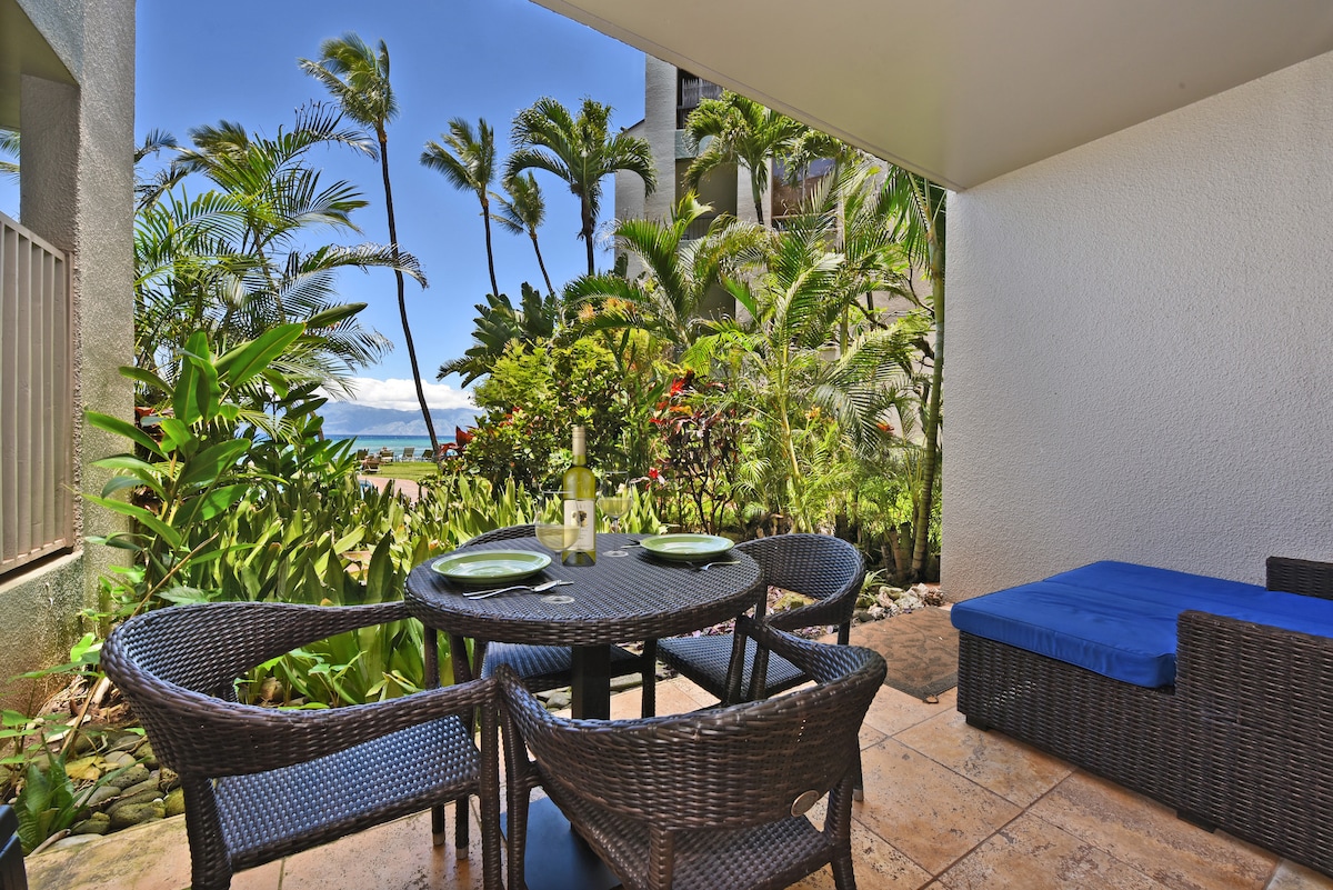 Maui Gov’t Approved Short Term Rental - Hotel District- Direct beach access with ground floor spacious lanai. Unreal views from this one bedroom, one sofa bed ground level entry, beachfront condo located directly on Kaanapali Beach. Central AC with LR and BR providing separate direct walkout to the lanai and 15 steps away is the beach! 75" TV, Sonos system, Apple TV, washer/dryer etc. Stocked kitchen includes coffee makers and supplies to get yourself ready for romantic dinners with the sunset!