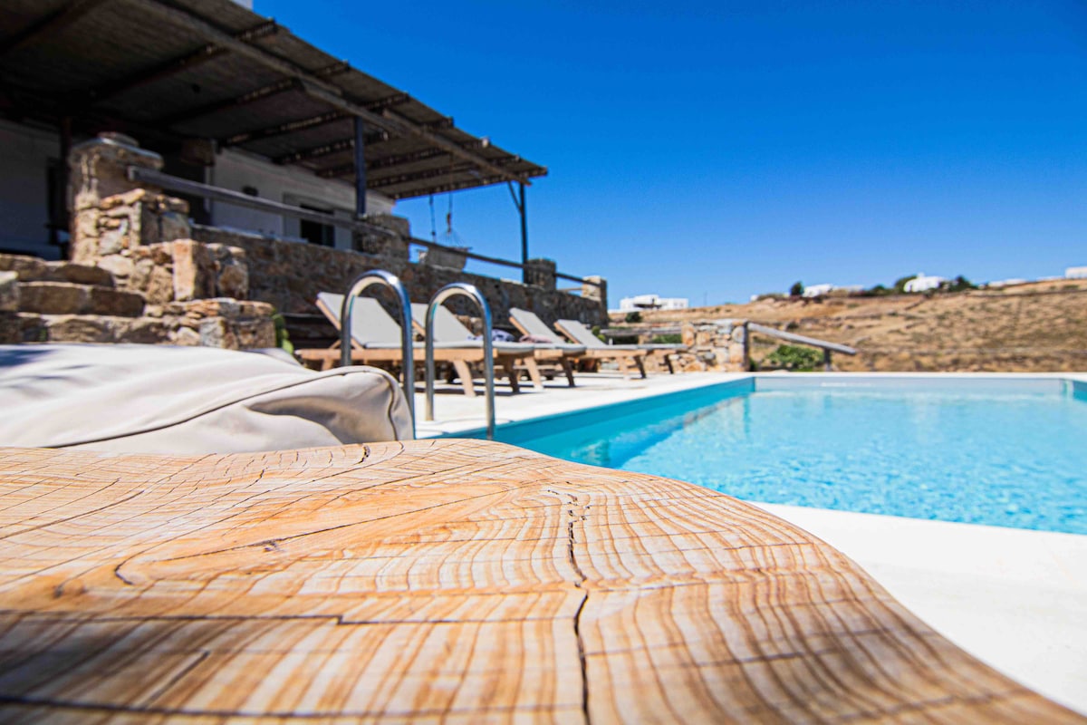 *LA PISCINE EST PRIVÉE* Cet appartement moderne dispose de 2 chambres, 2 salles de bains et un espace extérieur privé avec une vue exceptionnelle sur Mykonos, la mer Méditerranée et les îles des Cyclades. L'intérieur vient d'être rénové et tout est neuf. Nouvel appartement situé à 4 minutes (à pied) de la ville et de la plage d'Ornos et à 5 minutes en voiture de la ville de Mykonos. À 2 minutes (à pied), il y a un arrêt de bus qui vous emmène à la ville de Mykonos. Nettoyage quotidien inclus. Piscine privée avec vue panoramique sur la mer. Parking privé.