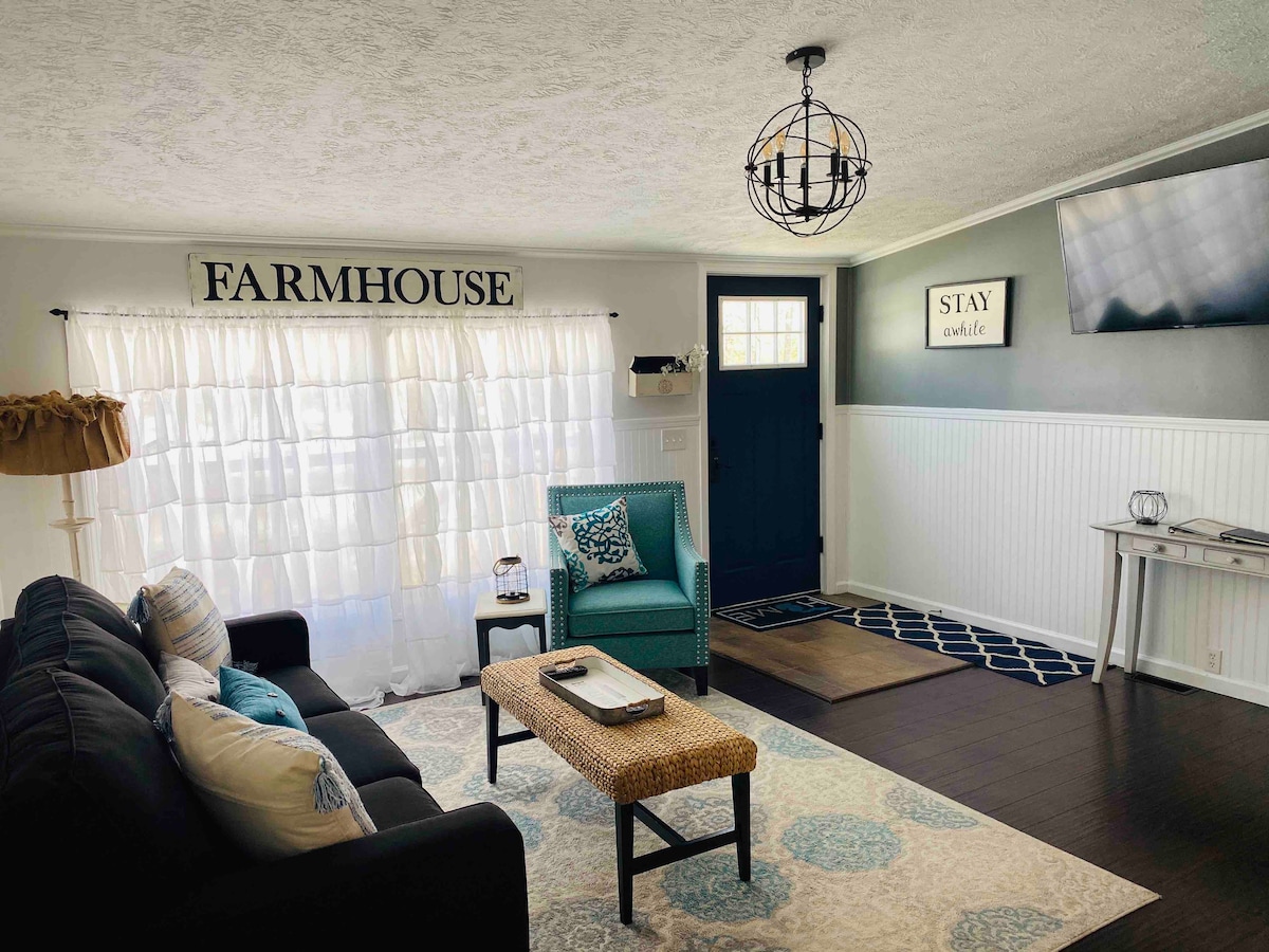 Cette maison de 3 chambres et 2 salles de bain a été entièrement rénovée et dispose d'un décor de ferme moderne. La maison se trouve sur près de 20 acres et dispose d'un grand étang avec fontaine (avec plage de sable fin !) et d'un ruisseau traversant la propriété. Bien que proche de la ville, cette propriété offre une grande intimité et confidentialité. La cuisine entièrement équipée comprend des plans de travail en granit et des appareils électroménagers en acier inoxydable. Le concept ouvert du salon et de la cuisine avec îlot en fait un espace idéal pour les réceptions ou les grandes familles !