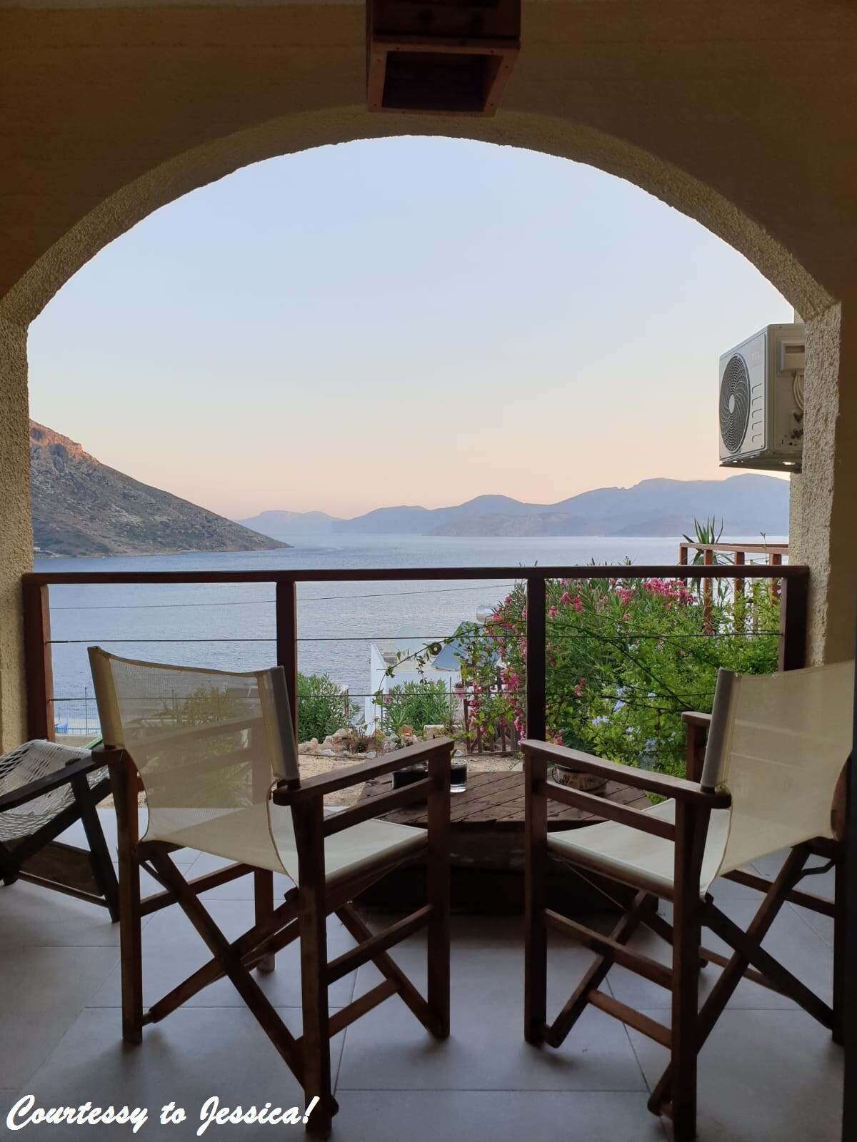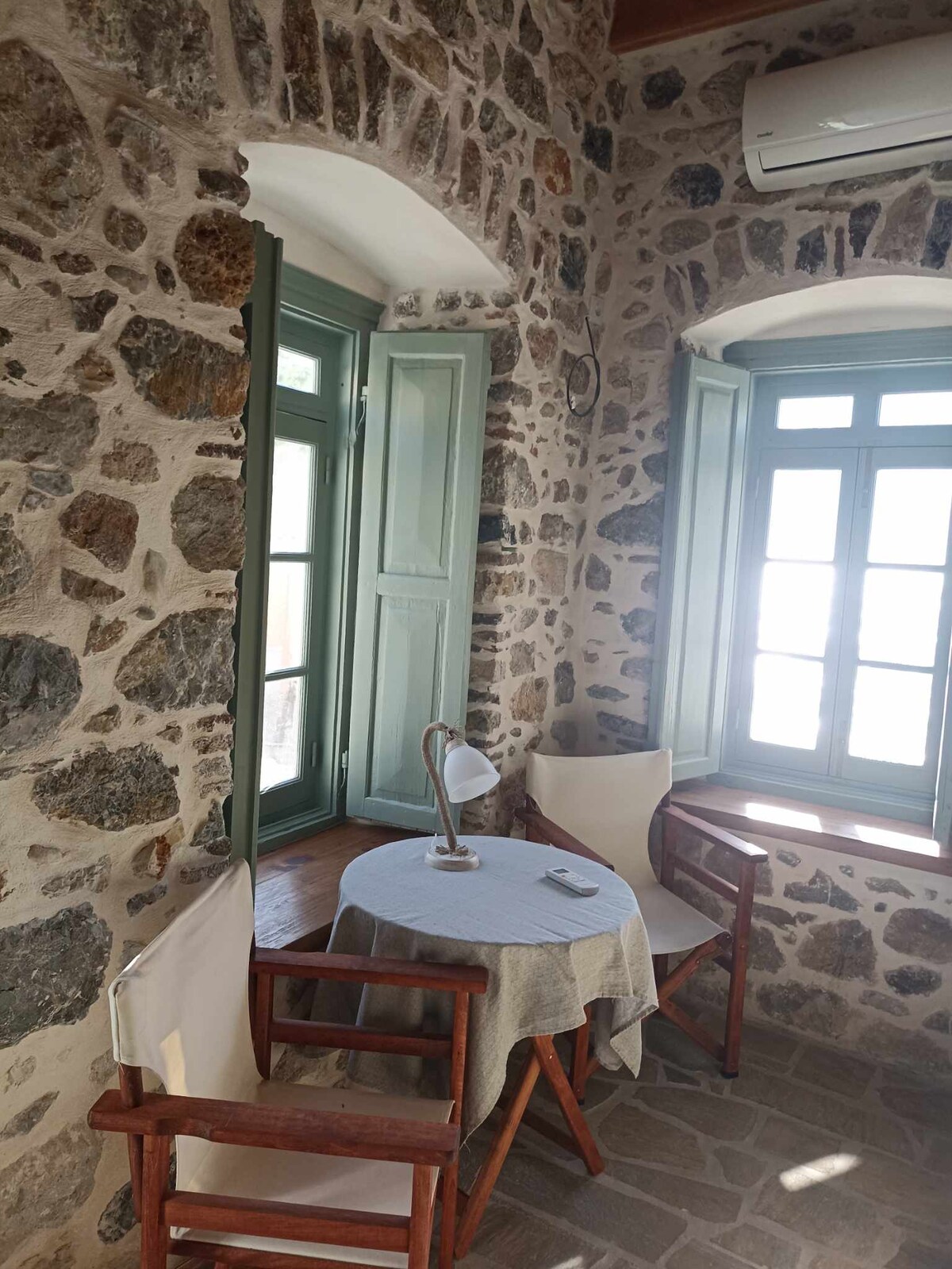 Dans Massouri Armeos directement sous Grande Grotta. Juste rénové, coloré peint et avec de beaux détails. Chaque studio dispose d'un balcon au bord de la mer. En outre, nous avons une grande terrasse à flanc de montagne avec une grande table commune et un barbecue. Wifi rapide et un lieu de travail facilitant le bureau à domicile/la télécommande de réveil.