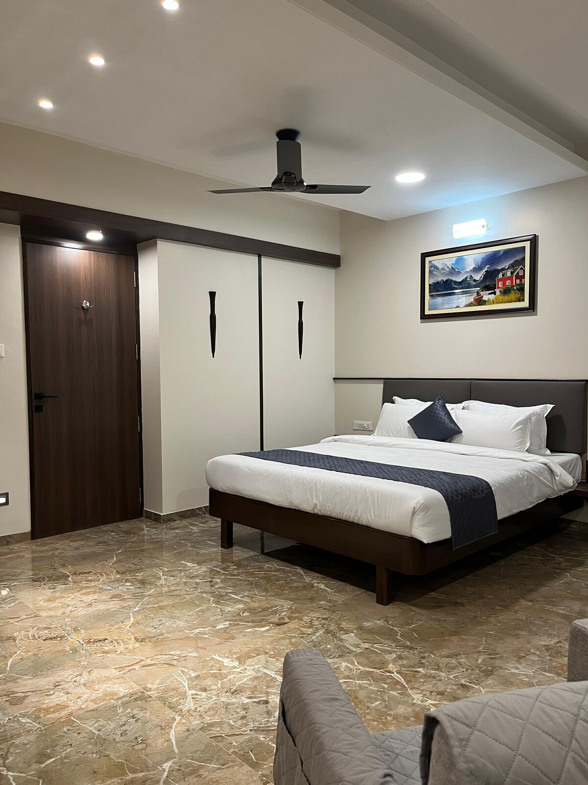 Découvrez le summum du luxe et du confort dans le studio « Varuna ». Appartement de 305 pieds carrés d'un espace méticuleusement conçu,offrant un mélange parfait de style et de fonctionnalité. Cette suite exquise comprend une chambre spacieuse studio climatisée avec kitchenette de garde-manger et toilettes attenantes. Lit King Size + lit simple +chaise. Purificateur d'eau commun RO dans le hall. Il N'Y A PAS D'ASCENSEUR pour accéder au 1er étage. Réception et zone d'attente sur G.floor+24hr Power backup+Carparking+ à proximité de l'autoroute Pune-Hyd. 1 des 4 unités par Kuber Suites.