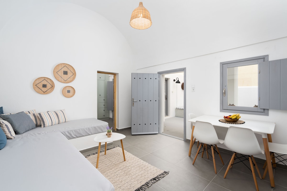 Le studio confortable de 25 m² comprend 2 lits simples qui peuvent être réunis pour former un lit double, un canapé-lit et une kitchenette. Il est équipé de tout ce dont vous avez besoin pour des vacances reposantes et sûres. Le studio est à usage privé (non partagé avec d'autres voyageurs). La plage de Kamari et l'arrêt de bus sont à seulement 2 minutes. L'un des principaux avantages est son emplacement, offrant un accès facile aux magasins, aux restaurants et à un marché ouvert 24h/24. Il est bien relié par bus à la ville de Fira et au reste de l'île