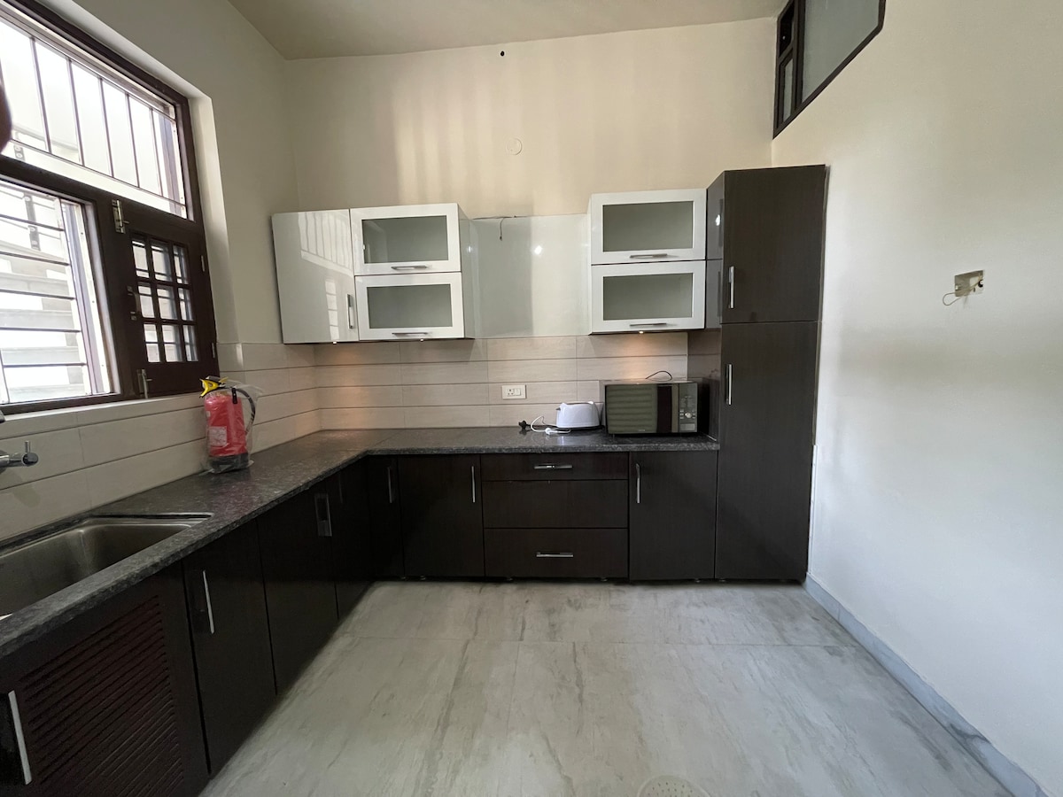 • Newly built, fully private1st floor apartment • 3 king-size bedrooms, 2 bathrooms, huge living & balcony with green views • Modular kitchen, induction plate, RO water & basic cookware. Swiggy/Zomato/Instamart/Blinkit available • Split ACs, optional heating, LED wall panels, & optional karaoke nights • Prime city-center location: Close to Golden Temple, local shops-eateries • Family & group-friendly, quiet calm residential vibes • Personalized local guidance from host & premium comfort