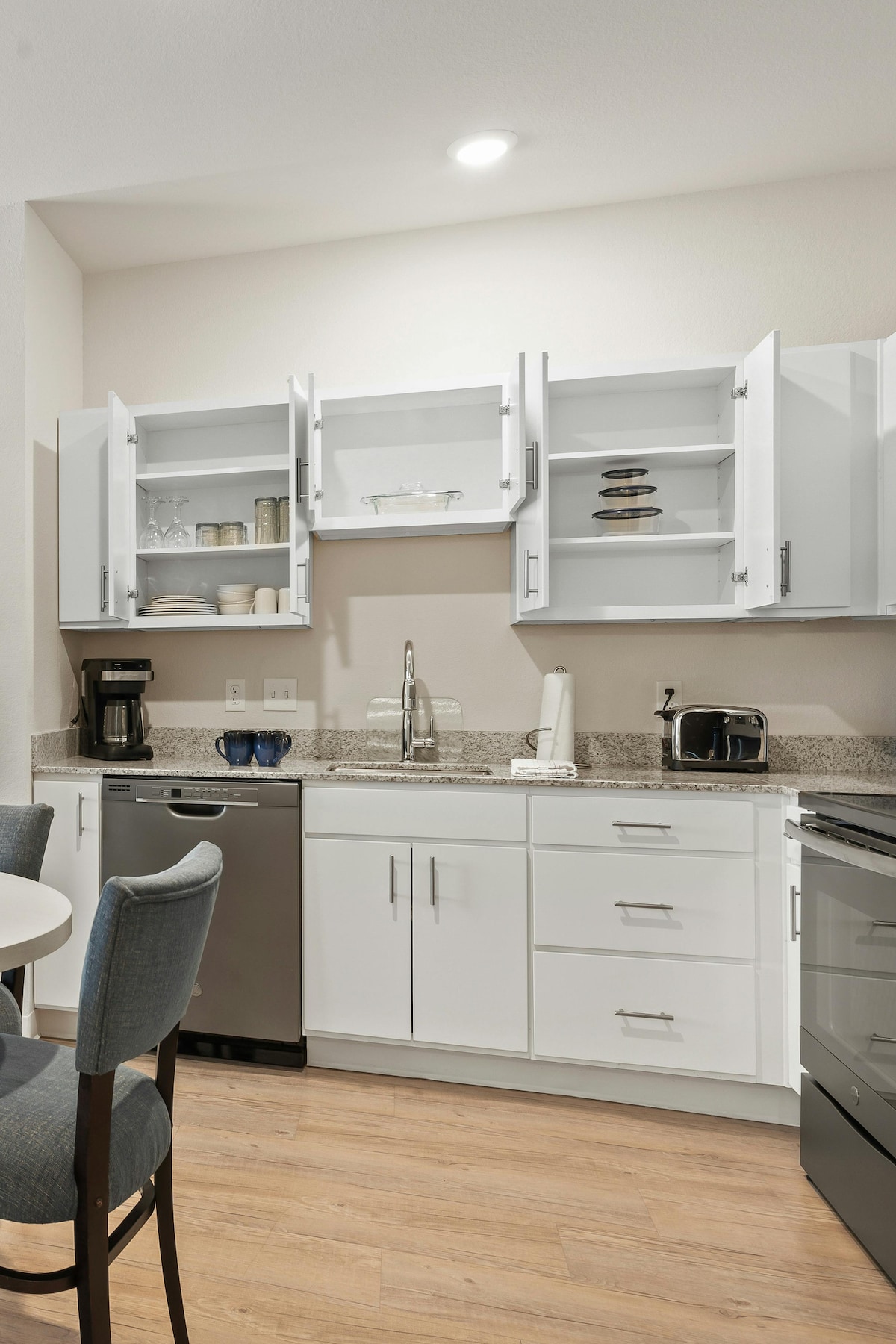 Nos suites d'une chambre sont rafraîchies avec une lumière naturelle et des accents lumineux, nos suites disposent d'un lave-linge et d'un sèche-linge dans la chambre, d'une cuisine complète avec des plans de travail modernes, d'une télévision à écran plat, de salles de bains au design efficace et d'un sol en planches de style bois qui réchauffe l'espace pour se sentir comme chez soi.