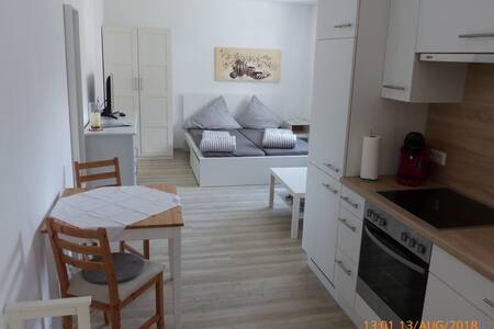 Notre appartement de vacances non-fumeur de 40 m2 est situé à l'arrière de notre maison avec un petit jardin et des sièges pour nos clients. Équipement : cuisine avec coin repas, 1 chambre (3 lits), salle de bain/WC (baignoire), TV par satellite. , 1 place de parking devant la maison. Les torchons, les serviettes, les draps et le papier toilette sont fournis 1 x. Animaux non autorisés ! Dans l'appartement, il y a 2 pièces verrouillées qui ne peuvent être utilisées que par le propriétaire.