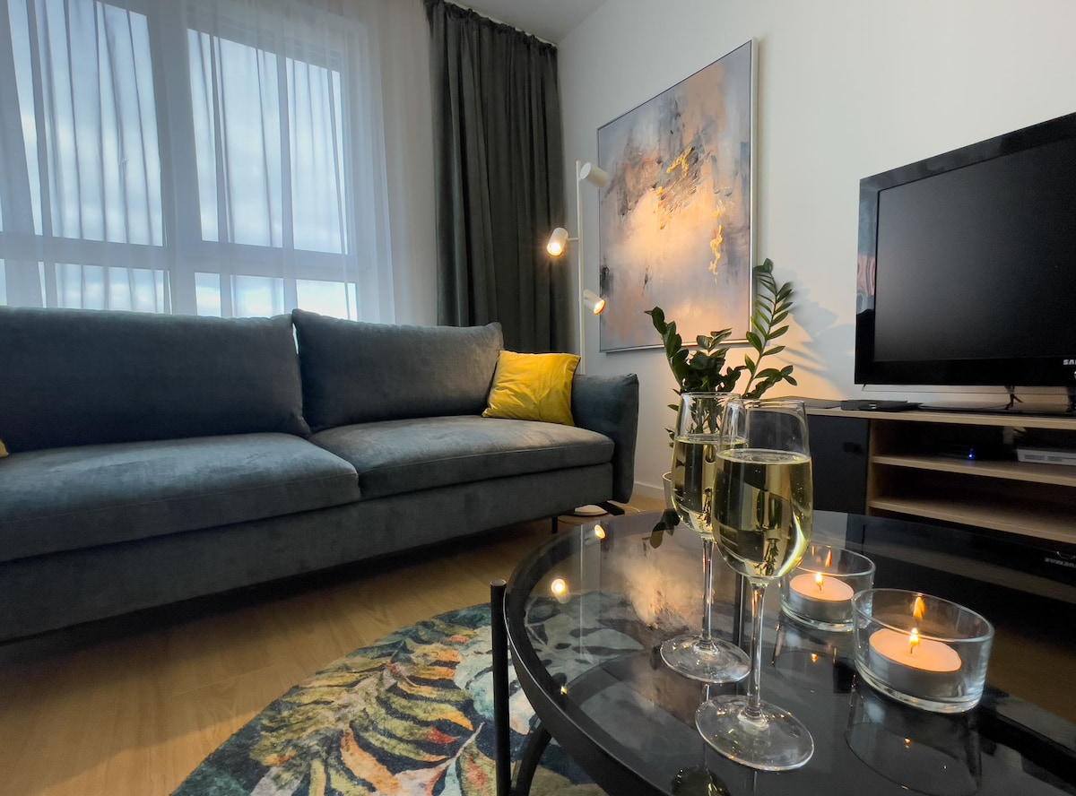 Appartement ensoleillé et confortable dans le premier arrondissement. Vue imprenable au 10e étage ! Plus de 100 m² (dont 20 m de terrasses) - 2 chambres privées verrouillables pour dormir et travailler, plus 2 autres places pour dormir dans le séjour. Parfait pour les célibataires, les couples et les voyageurs d'affaires avec ou sans famille. Excellent emplacement près de Spodek, NOSPR et du Centre des congrès. Le bâtiment dispose d'une épicerie, d'un barbier, d'un salon de massage thaïlandais, de Wine Taste by Kamecki.