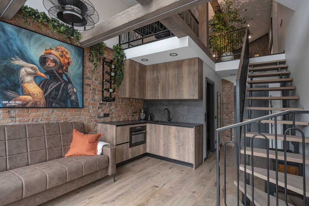 Escape to this stylish two-level loft that blends modern comfort with rustic charm. Enjoy a bright living area with large windows overlooking a peaceful garden, a cozy lounge terrace with string lights, and a beautifully designed bedroom under wooden beams.