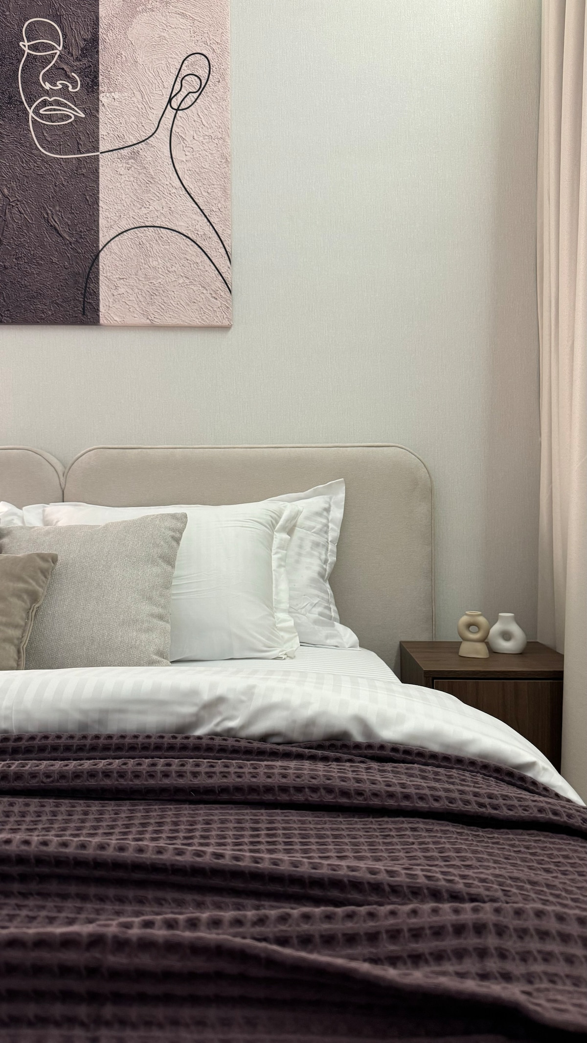 Appartement élégant au cœur même d'Almaty — sur la promenade d'Esentai, à côté du centre commercial Esentai, du parc et des meilleurs restaurants de la ville. Une fresque unique, une cheminée confortable, une décoration design et une vue sur la montagne depuis le 4e étage créent une atmosphère de confort et d'inspiration. Cuisine équipée, appareils électroménagers, verres à vin et variétés rares de thé. Pour les voyageurs séjournant 5 nuits ou plus, une bouteille de vin kazakh Arba en cadeau. L'espace de 48 m² est idéal pour un couple, un voyage créatif ou un voyage en solo.