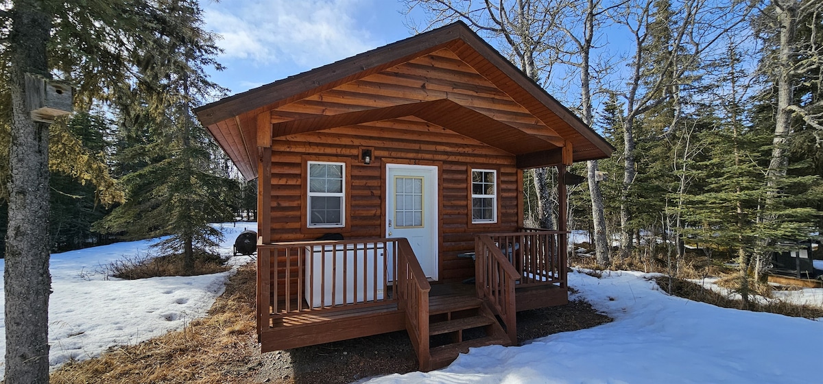 5 cabanes décorées de manière unique servent de base à tous vos plaisirs en Alaska ! Chaque cabane fait 500 pieds carrés et dispose d'une petite cuisine, d'une salle de bain avec douche carrelée, d'une chambre et d'un loft. Accès à la rivière Kenai pour la pêche à quelques pas de votre cabane. 13 acres permettent de voir la faune depuis votre porche tout en prenant un café de la cafetière Keurig. Nous avons également 6 sites de camping-car avec raccordements complets. Camping sec. Cabane de buanderie avec lave-linge et sèche-linge à pièces. Il dispose également d'une salle de bains supplémentaire avec 2 douches.