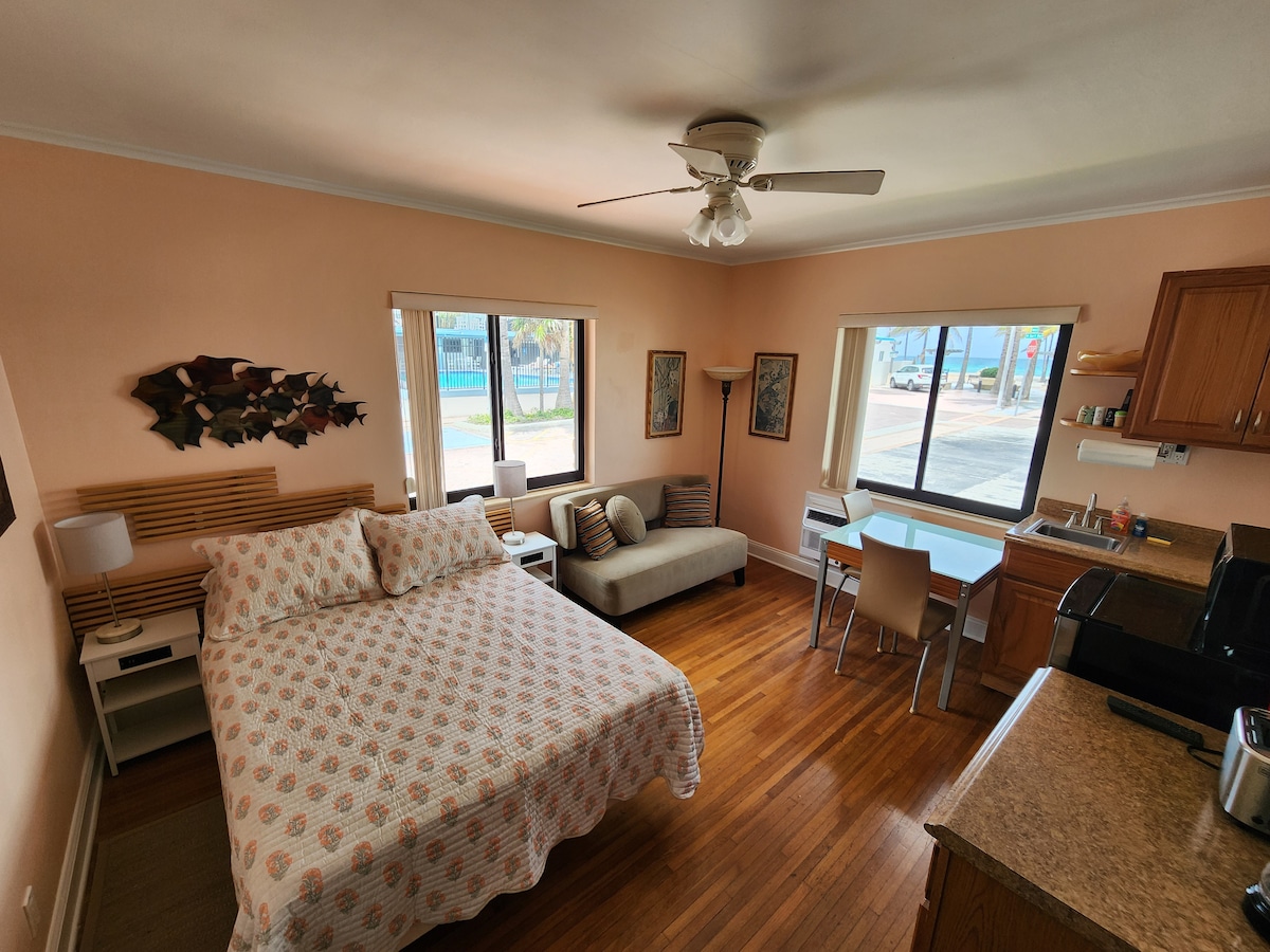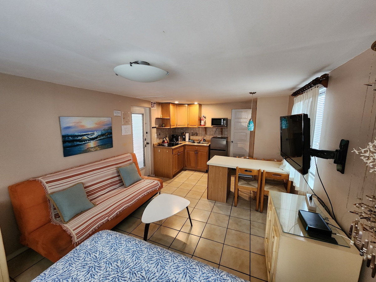 This an open plan unit with direct views to Florida Bay. It is furnished, Central air conditioning, Free WI-FI, Cable Television with 75 channels. Linens are provided and the kitchen is fully equipped for cooking. You have private screen porch, parking in front and can even sit out back over looking Florida Bay or use our man made white sandy beech about 10' away. We have a Marina, Boat Ramp, Fire Bowl with firewood and are part of Kings Kamp RV Park.