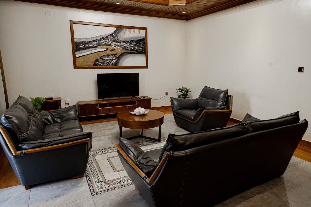 Vous apprécierez le décor unique et élégant de cette retraite sereine et ensoleillée. De grandes fenêtres inondent l'espace de lumière naturelle, complétant des draps blancs impeccables et des serviettes de bain moelleuses pour une touche de luxe quotidien. Sortez dans un jardin pittoresque et tranquille, parfait pour méditer, lire ou simplement vous détendre. Profitez de la vue sur un parc verdoyant depuis votre chambre et faites une courte promenade jusqu'au terrain de golf le plus vert du Rwanda et à son seul lac artificiel. Une escapade paisible - restaurants et commerces à proximité !