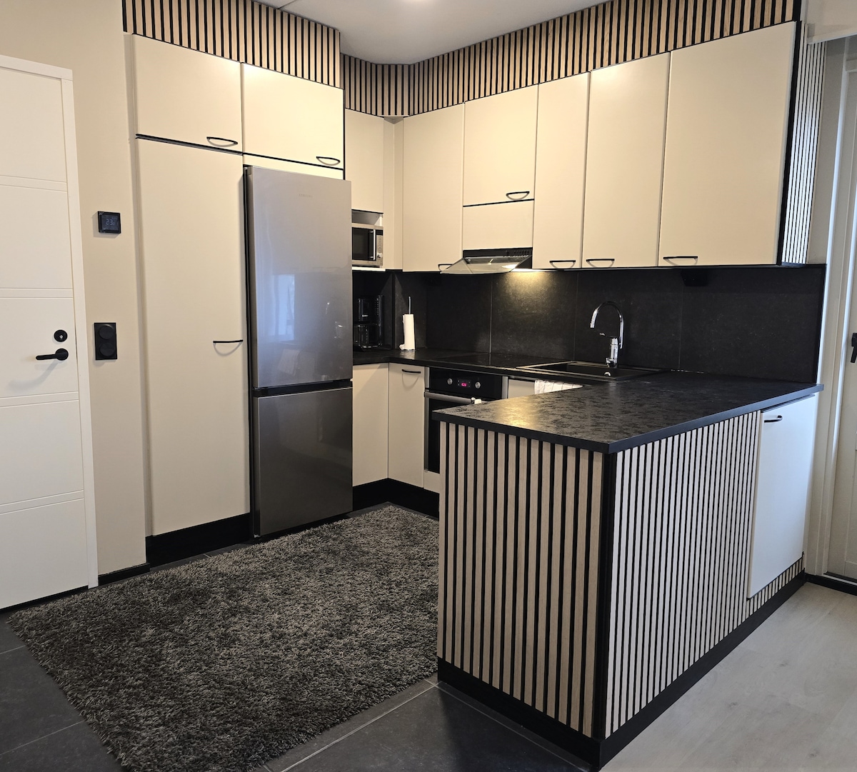 Appartement au deuxième étage relié à une nouvelle maison individuelle. Entrée privée. Climatisation. En bordure d'une forêt dans un nouveau quartier résidentiel du nord d'Oulu. Parfaitement adapté aux vacances et aux voyages d'affaires. Une excellente escale pour ceux qui voyagent vers le nord ou le sud. Vous permet de profiter à la fois des services de la nature et de la ville. Bienvenue dans le milieu arctique paisible ! Appartement de 36 m2+salle de bain 6 m2. Lit King Size double/simple de haute qualité, canapé convertible et lit d'appoint. Mini cuisine. Code verrou sur la porte. Parking gratuit.