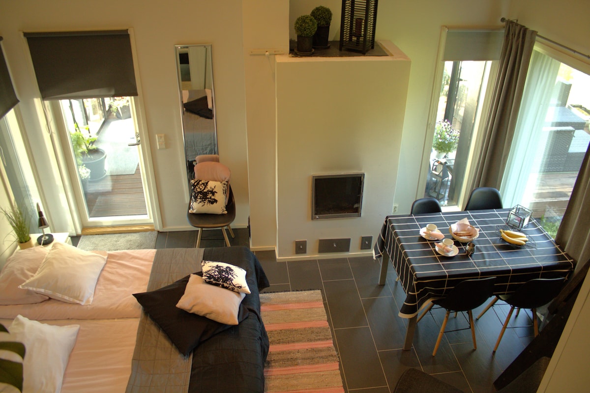 Maison unique et chauffée de terre magnifique condo avec entrée privée, chambre, coin repas, sauna, douche et toilettes. Pour ceux qui restent 2 nuits, le jacuzzi fait partie du séjour pour 2 heures/jour. Sinon, la location est pendant le séjour pendant la semaine Sun-Thu 35e/2h et Fri-Sat 49e/2h. Situé dans un nouveau quartier résidentiel près de la nature, à portée de main. Lit double queen size de haute qualité, canapé convertible de 120 cm et possibilité d'un lit d'appoint de 90 cm. Serrure à digicode. Parking gratuit.