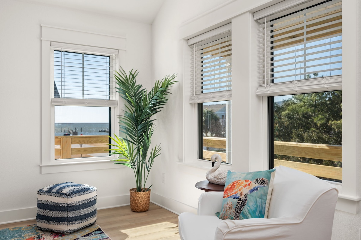 Niché dans cette escapade unique et tranquille, surplombant Kitty Hawk Bay, réveillez-vous au lever du soleil sur la terrasse qui est l'un des endroits les plus élevés de Colington Harbour. Regardez le coucher du soleil au milieu de l'Albemarle Sound, tout en profitant d'une vue à 180 degrés depuis la terrasse. Profitez de la piscine du club, des courts de tennis, de l'aire de jeux de la marina et du parc sonore au bord de l'eau. Ce logement de 2 chambres et 2 salles de bain a été récemment rénové avec tout le confort d'un chez-soi.