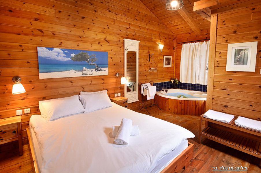 Une luxueuse cabane en bois dans un magnifique complexe hôtelier à Tibériade, à distance de marche de la promenade et de la mer de Galilée, qui offre à ses clients une grande piscine chauffée, un grand jacuzzi spa, un sauna, un coin barbecue à gaz, une variété de sièges extérieurs et une grande salle à manger avec une cuisine. La cabane dispose d'un lit double, d'un canapé convertible double, d'un jacuzzi dans la chambre, d'une kitchenette et d'une salle de bain. Convient à 4 voyageurs.