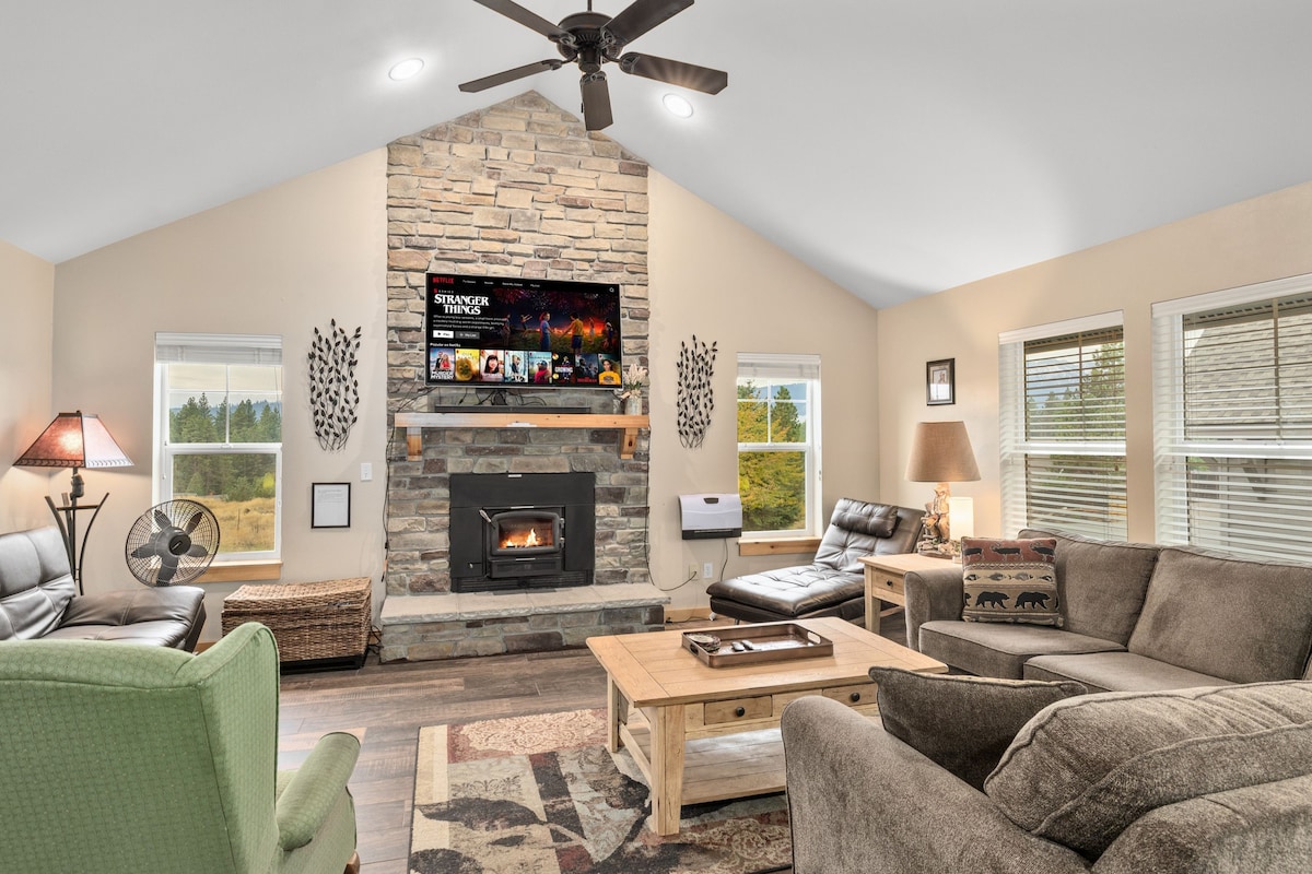 Cozy Roslyn Ridge Retreat with Pool, Hot Tub & Mountain Access Discover the perfect blend of mountain charm and modern comfort at this inviting 3-bedroom retreat in the highly sought-after Roslyn Ridge community — a hidden gem tucked between Cle Elum Lake, Suncadia Resort, and the historic towns of Roslyn and Ronald, WA. Whether you’re seeking a peaceful family getaway or an adventure-filled escape, this townhome places you at the heart of Central Washington’s outdoor playground. Spend your days paddleboarding across crystal-clear Cle Elum Lake, hiking scenic alpine trails, or exploring Roslyn’s local breweries and shops. When the snow falls, head out for snowshoeing, sledding, or snowmobiling straight from the ridge. As the sun sets, return home to unwind in the open-concept living room, where a crackling stone fireplace and cozy lodge décor set the scene for a relaxing evening. Fire up the grill and enjoy dinner under the stars on your private furnished balcony, surrounded by fresh mountain air and pine-lined views. The Space This warm and welcoming home comfortably sleeps up to 6 guests and features rustic Northwest décor, vaulted ceilings, and modern conveniences throughout. Bedrooms Primary Bedroom: King bed, ceiling fan, ensuite access Bedroom 2: Queen bed, natural light, closet space Bedroom 3: Full bed Additional: Queen air mattress and crib available Bathrooms Full bath upstairs Half bath conveniently located on the main level Community Amenities Guests of Roslyn Ridge enjoy exclusive access to: Heated seasonal pool & hot tub (open Memorial Day – Labor Day, $10 per person per day) Sport courts for basketball, tennis, and sand volleyball Children’s playground, BBQ picnic area, and clubhouse with lounge spaces Home Highlights Open-concept living room with smart TV and gas fireplace Fully equipped kitchen with island seating, dishwasher, blender, Crockpot, and coffee maker High-speed Wi-Fi, ceiling fans, and portable A/C units for summer comfort In-unit washer/dryer, linens, towels, and complimentary toiletries provided Location Situated in the peaceful Roslyn Ridge community, you’ll be: 5 minutes to Cle Elum Lake – boating, kayaking, and fishing 7 minutes to Downtown Roslyn – cafés, breweries, and local shops 10 minutes to Suncadia Resort – golf, spa, and fine dining 90 minutes from Seattle, making it an easy weekend mountain escape Guest Access & Parking Guests have full access to the home and all Roslyn Ridge amenities. Driveway parking is available for 2 vehicles, with additional parking in the community lot. (Garage parking unavailable.) Additional Details Pet-friendly (dogs only, $50 fee) No smoking, events, or large gatherings Two steps at entry; stairs to bedrooms Why Guests Love It This mountain-modern retreat combines the privacy of a peaceful neighborhood with access to resort-style amenities. Whether you’re here for summer lake days or winter snow adventures, Roslyn Ridge offers year-round fun and the perfect home base for exploring Central Washington’s alpine charm.