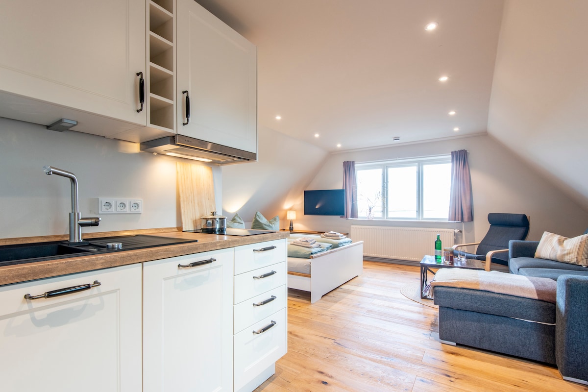 Notre hébergement est situé directement sur la digue et à proximité de la zone de baignade de Südwesthörn. L'emplacement calme et isolé et l'impasse permettent à nos petits hôtes de jouer en toute sécurité devant notre maison et la digue. L'air sain, riche en sel et en iode, aidera tous les hôtes souffrant de problèmes respiratoires à respirer à nouveau.