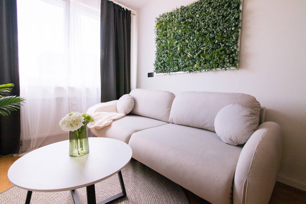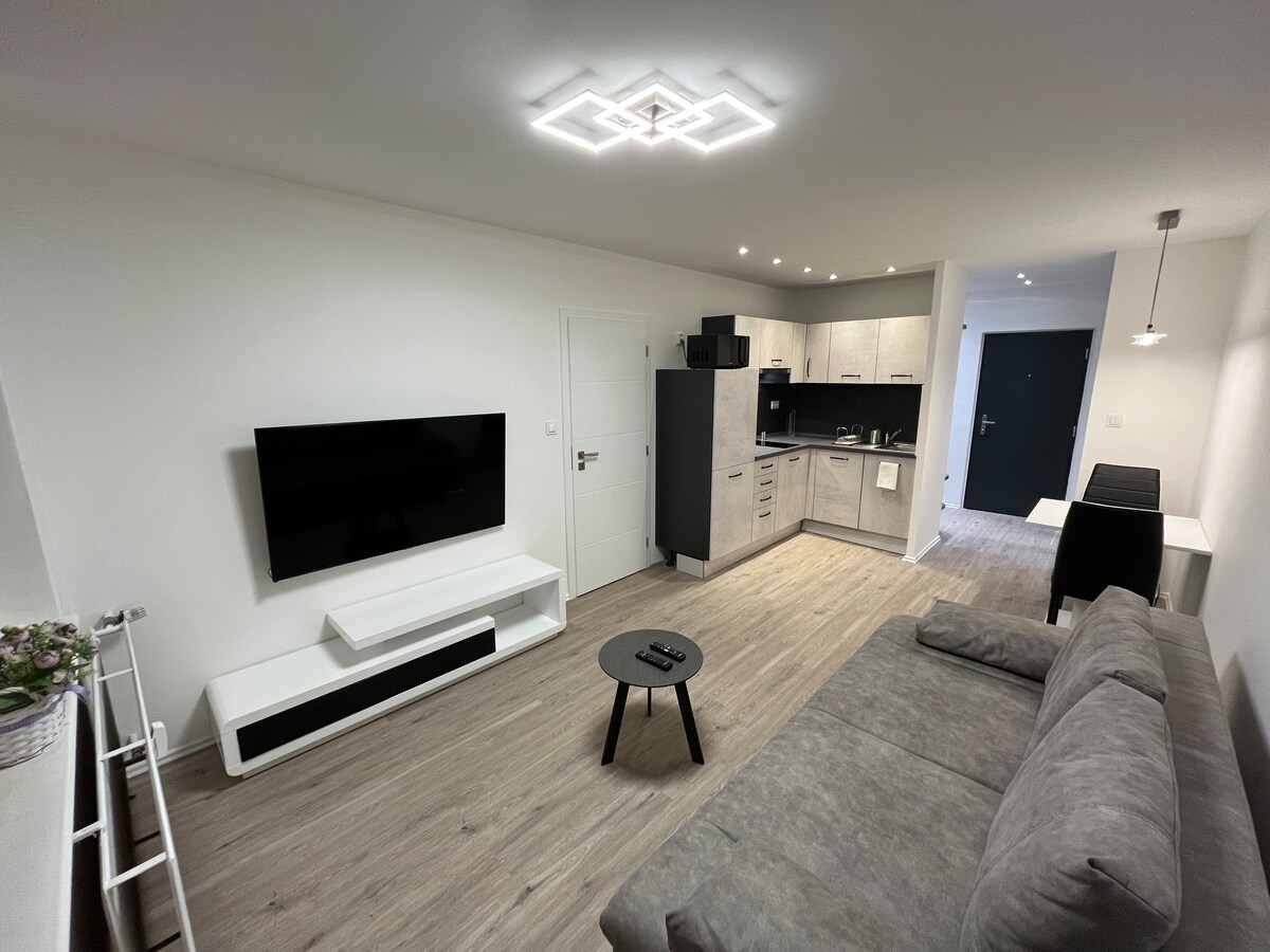 Relax in this unique and peaceful place. A stylish 2-room apartment is set in a new area with a shopping center and easy access to the highway towards Prešov, Hungary and Volvo. The city center is 5 minutes and the airport 15 minutes away by car. The apartment offers a large terrace, a high-quality coffee machine and a bathroom with a bathtub and a shower. Walk to the lake, the landscaped garden or the bus stop for a view of the city. Free parking is available right in the building.