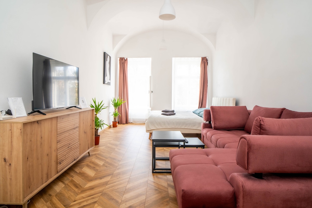 Situé dans la cour fermée du bâtiment pittoresque, l'appartement offre tout ce que l'on peut rechercher. Découvrez la vie du centre historique avec tous les cafés, restaurants, marchés ou autres sites touristiques comme si vous aviez tout à portée de main, tout en profitant du calme absolu de la cour arrière fermée en sirotant votre thé ou votre vin dans un jardin tranquille. Le design soigné pour deux personnes comprend tout, chambre, salon et kitchenette entièrement opérationnelle et une salle de bain généreuse.