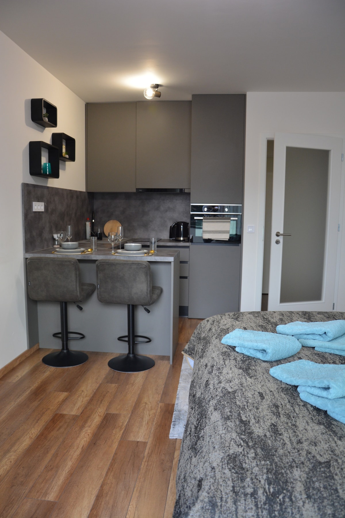 Votre nouvel appartement minimaliste dans le domaine de Nova terasa offre un séjour confortable pour 2 personnes maximum. Il est situé dans un nouveau domaine à quelques minutes du centre-ville. Le logement est entièrement meublé (appareils de cuisine, Wi-Fi, télévision Antik, haut-parleurs muraux intégrés, etc.) et est prêt pour votre séjour. Un parking gratuit est prévu dans un espace désigné juste à côté de la porte d'entrée. La sécurité de la propriété et des invités est assurée par une société de sécurité privée.