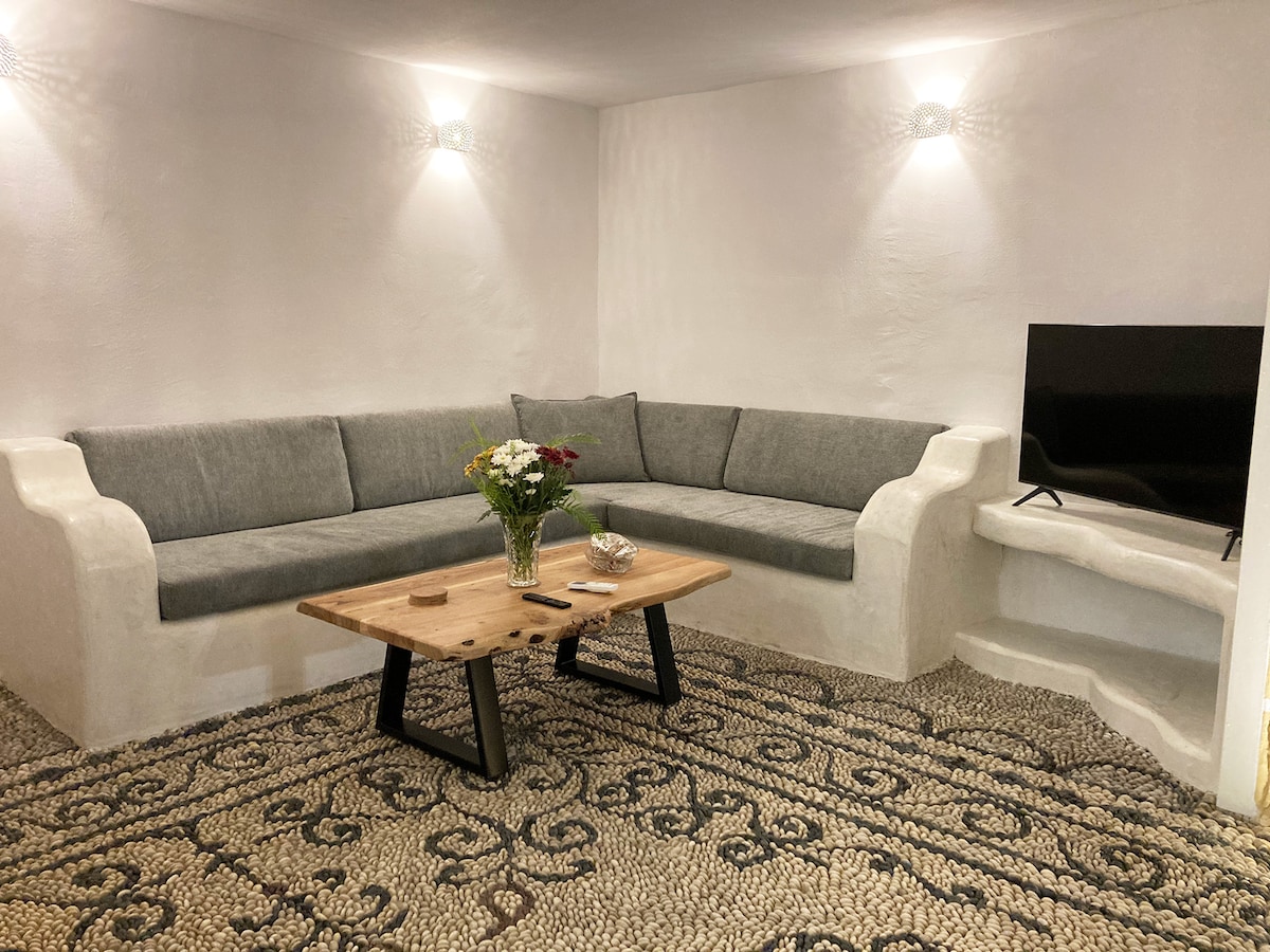 Profitez de la détente ultime dans ce studio élégant et entièrement équipé avec une vue panoramique à couper le souffle sur la mer. L'appartement dispose d'un lit double confortable et d'un canapé-lit, idéal pour accueillir jusqu'à 3 personnes. La cour privée avec un salon extérieur vous invite à déguster votre café ou votre vin surplombant le bleu infini. Idéal pour les couples, amis ou familles à la recherche d'un hébergement de luxe avec confort et style, loin du bruit de la ville.