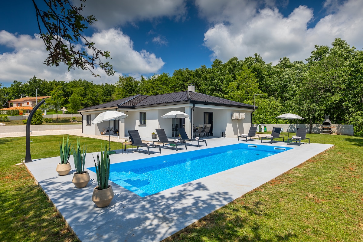 Oubliez vos soucis dans ce logement spacieux et serein. Villa neuve de 2 chambres avec vue sur le coucher du soleil et grande piscine privée de 35 m2, parfaite pour vos vacances relaxantes. La Villa Aquila est située dans un petit village istrien, à 10 minutes à pied du monastère bénédictin médiéval et à une demi-heure de route du bord de mer et de la ville côtière de Rovinj.