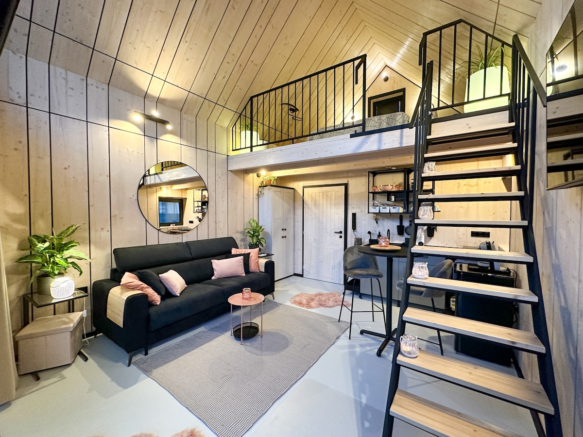 Humno est un bâtiment en bois au design loft. Les murs et les poutres en bois authentiques sont complétés par une caractéristique architecturale distinctive d'un « cube » qui est un symbole parfait de modernité. Sur la gauche se trouve une cuisine avec une plaque électrique, un lave vaisselle et un four. À droite, une salle de bain avec des toilettes Le centre du cube est conçu comme un mini bureau avec un lit d'appoint, et une chambre a été créée sur le dessus, ce qui est également une transition vers un filet d'escalade relaxant à une hauteur de 3,5 mètres. En dehors de Humna, il y avait une grande terrasse dans laquelle la machine de chauffage est installée.